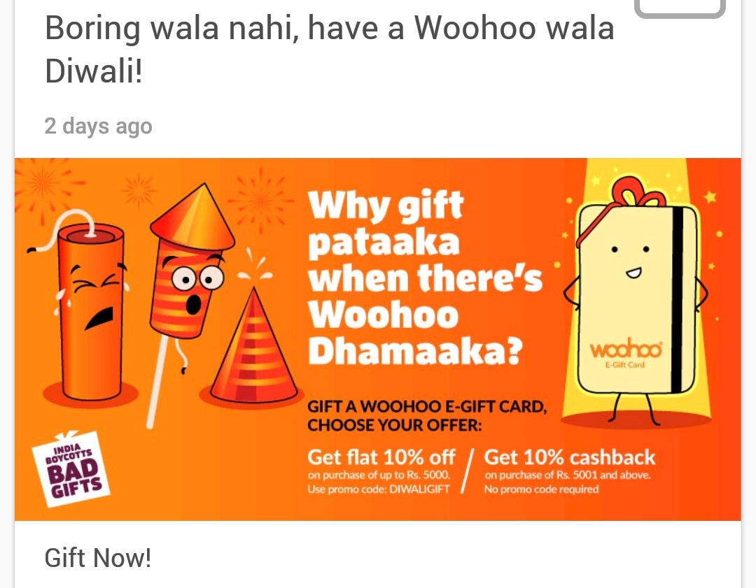 They sent a mail and a notification via app regarding a promotion stating 10% off on the purchase of Woohoo gift vouchers and they clearly stated that these vouchers can be redeemed to buy any vouchers on their site but when I received their voucher and tried to purchase Flipkart and Amazon voucher by redeeming that then I was unable to do that as after redeeming they say that this card is applicable only on selected gift vouchers which are not worthy for me.