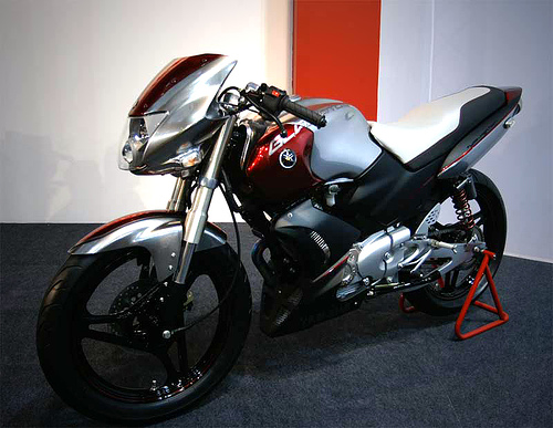 The bike comes in two tone color, and superb looking engine guard(Something that many riders do as an after market mod). The bike seems to have a very sporty riding position, which can be inferred from the handles, and the rear peg position. The bike does not have a mono shock(Not evident from the pic), and is most likely to have gas/liquid filled shocks.