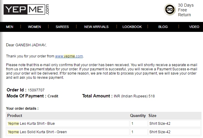 I had very bad experience from Yepme. Com. when you browse that site you just feel, all products are very high standard & modern but it's not true. they also give offers like buy 1 get 1 free. I am be victim by same offers. My brother had arrange one function at my home. so I had ordered *Yepme Leo Kurta Shirt - Blue Shirt Size* & *I got Yepme Leo Solid Kurta Shirt - Green* free In *Rs.518.* After 8 days Product come in my hand & I was very angry on myself because colour of Both kurta's are very poor. My mom shout on me because after one wash both kurta's are Bad fall & Split more than 3 place. I had tried customer care number but they told me, As per Yepme policy you never replace product after wash . So think twice before purchase from this website.