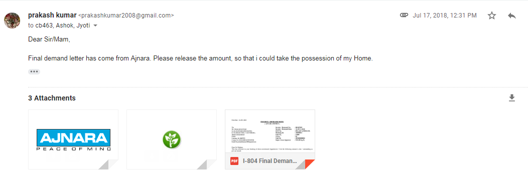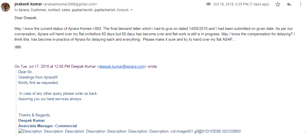 I have been sending several mails for the past 3 year regarding my flat however I still not received any substantial response from Ajnara. The flat that I had booked with Ajnara on 06-04-2012 was supposed to be handed over to be on April 2016. It's almost been 3 years since I have been desperately waiting for my flat. Each time I get a different excuse from Deepak. it was Company's responsibility to take care of there customers but I am sorry to say Company are unable to do that.