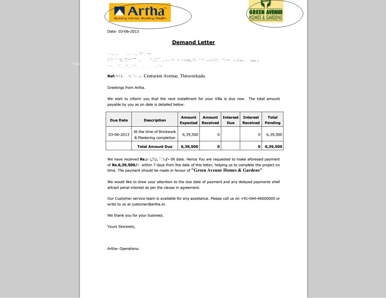 They will not respond to your telephone call or email . when  u ask artha properties they  give a stock answer we are not involved in this construction. we have disassociated from green avenue . but during the construction the correspondence was with Artha as seen in the pic you see a logo of Artha andGreen avenue homes and gardens in the letter head, they are the ones who send demand letter, all correspondence  is from artha regarding payments . so please beware when you buy from Artha  Properties.