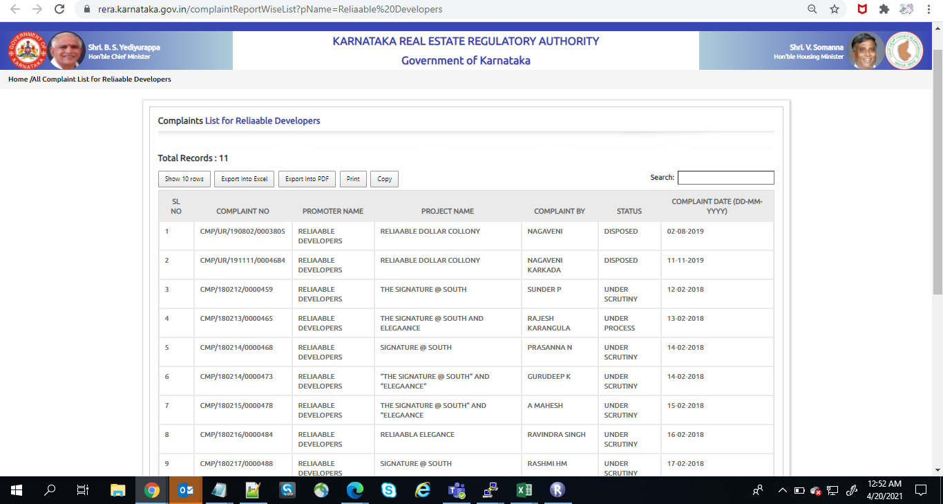 Check the link https://rera.karnataka.gov.in/complaintReportWiseList?pName=Reliaable%20Develope