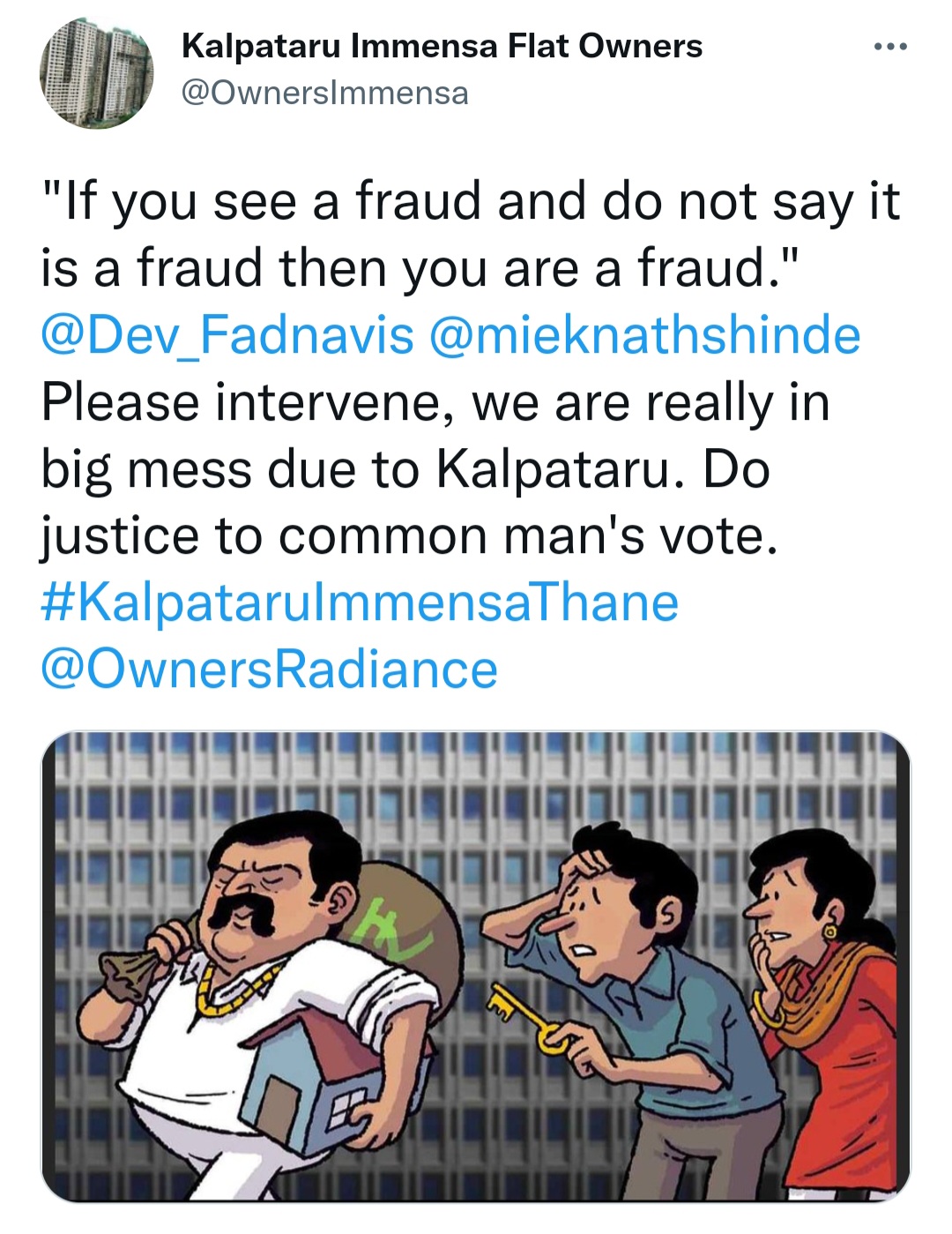 No possession no guarantee of completion of underconstruction immensa and starlight towers in kalpataru parkcity, thane.. kalpataru builder only giving new completion dates to owners since long time .owners show support on Twitter handles created by downers of immensa tower.refer attached photo..