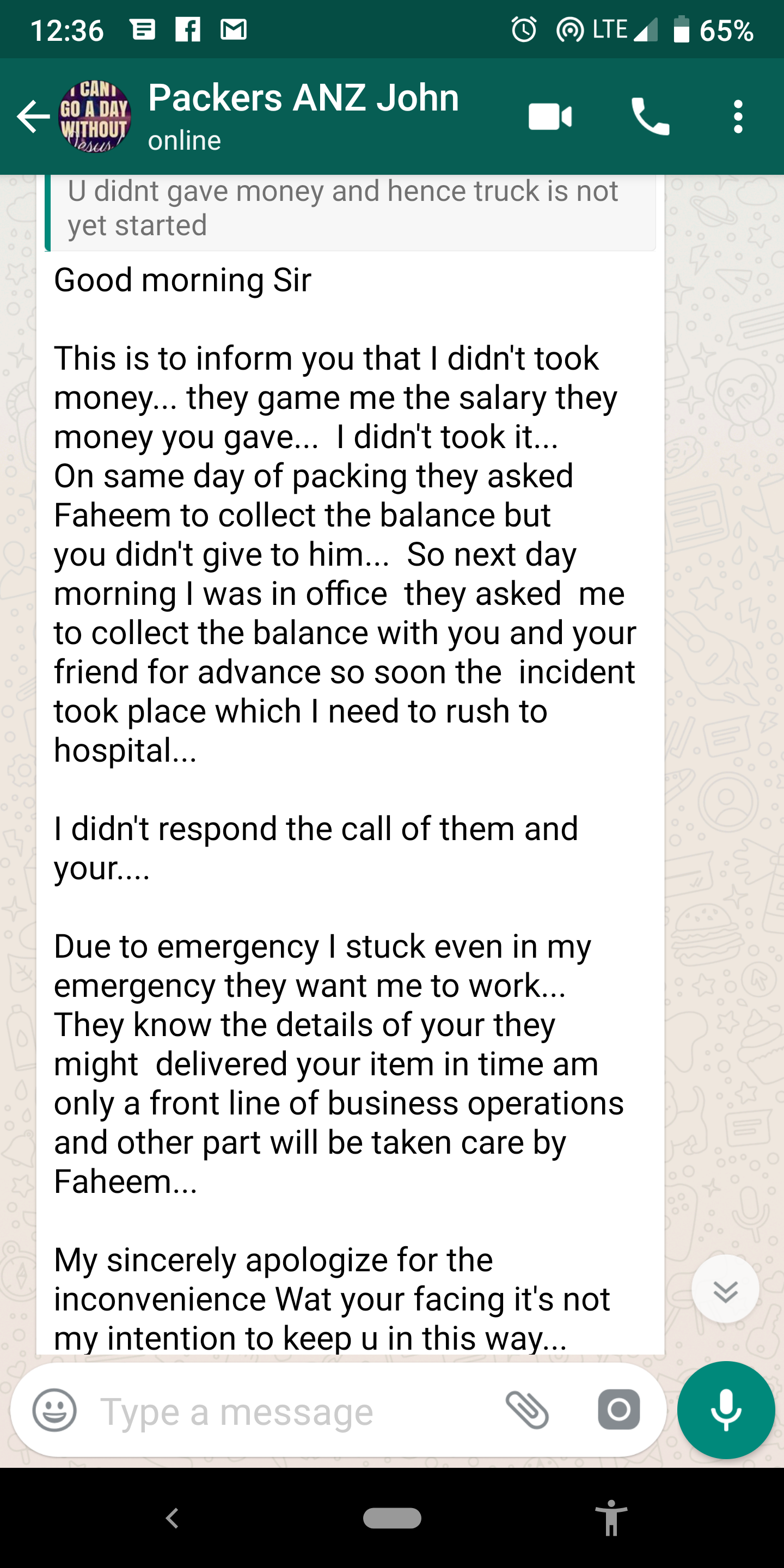 I was devastated by this information and tried to call John, Faheem and other number mentioned on the calls. There was no response. I was dead stuck as my goods are not yet even started and my advance money given to Mr. John was gone. Mr. John later sent a WhatsApp message conveying that he has to leave with my money since ANZ has not given him his salary !!!