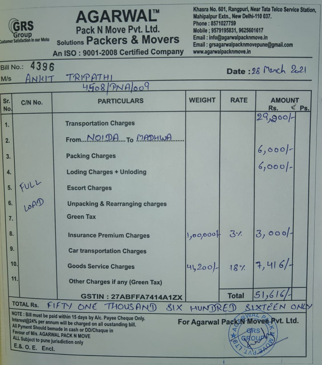 The deal was fixed at a cost of 41,200 door-to-door packings and unpacking with a delivery time of 3-4 days with a separate vehicle and GST insurance extra.
