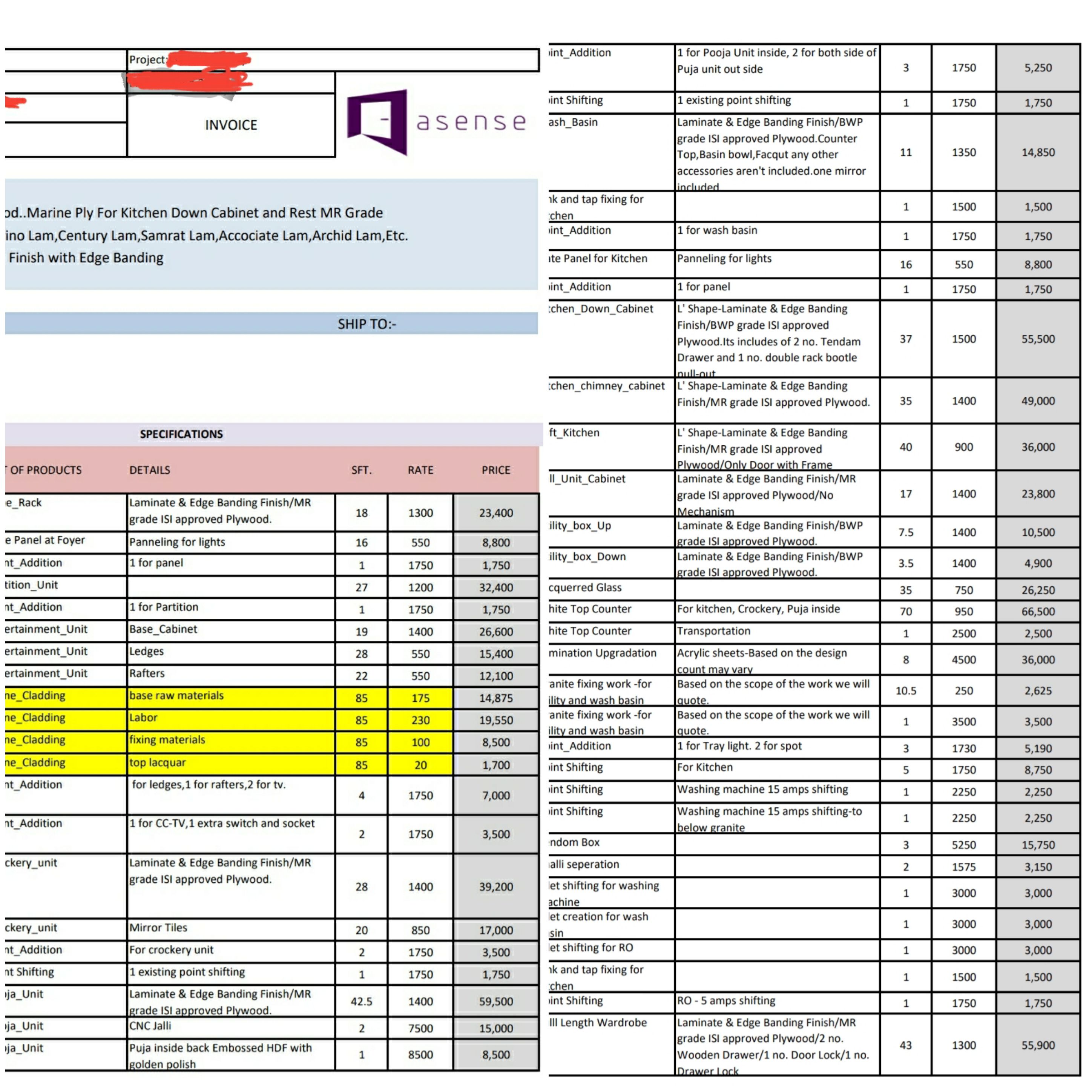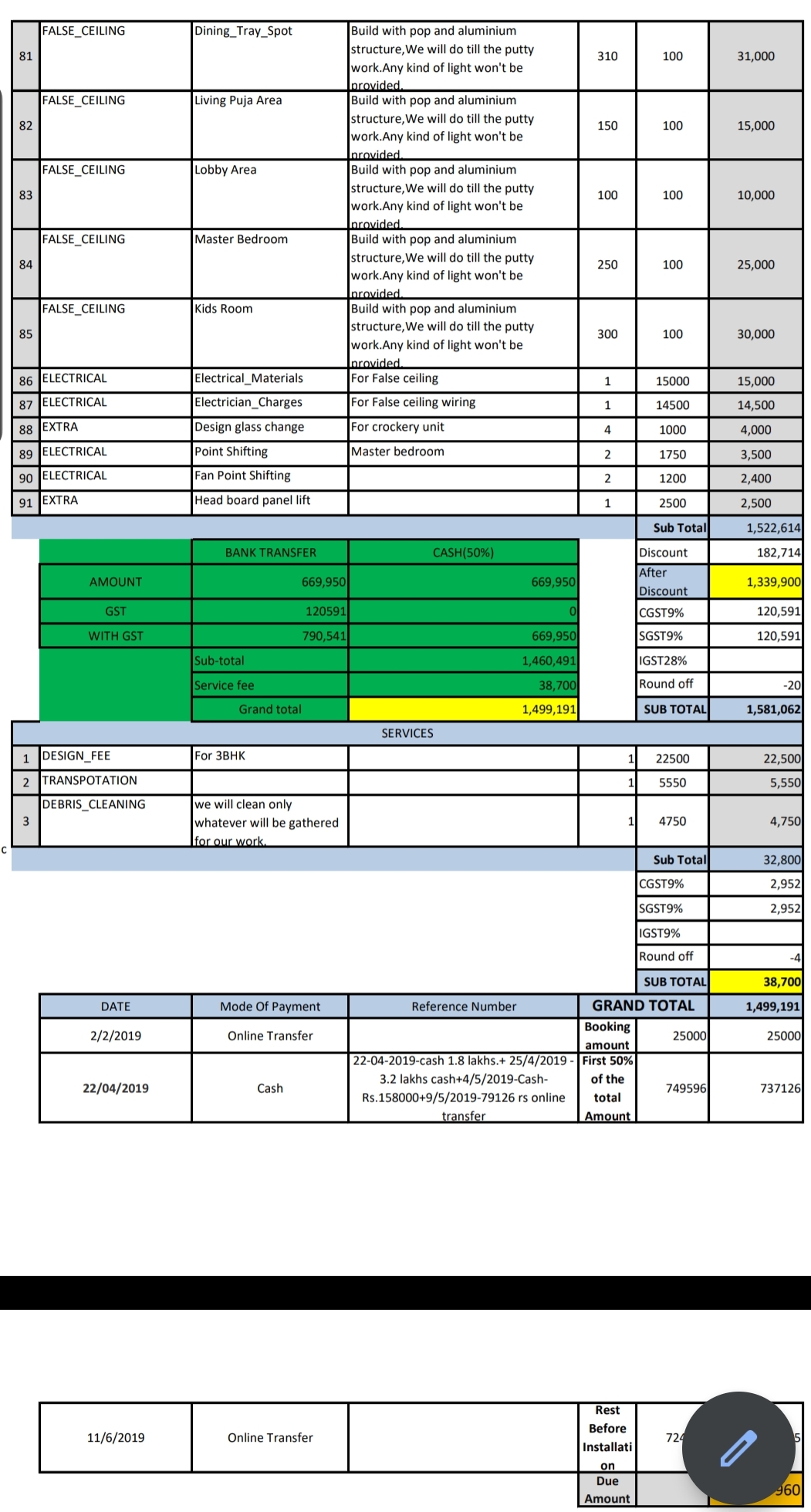 As my brother is a Structural engineer and also an interior designer, he told me that the false ceiling sqft area looks more in the invoice than the actual and he asked me to have it checked.