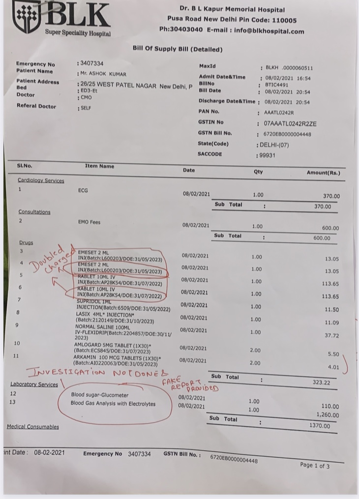 Moreover, when we saw the bill summary the 1st thing we noticed was laboratory service charges which are related to sugar added to my bill worth Rs 1370, and these investigations were never done as I was standing next to my father throughout his admission.