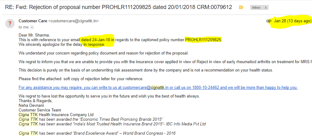 After doing my research I went back to Kunj's Number, he wasn't at the office by that time so the call was picked by some other agent. His name was Vaibhav Jagnam. He again explained me the same details as explained to me by Kunj and finally, I got convinced with him and made the aishwaryasingh23ment. 5038 Rs. Cigna Health protects plan of 2.5 lac. Then he told me that you will get a call from the doctor and you have to explain about the pre-existing disease that you have mentioned in form if required you have to provide the checkup docs of disease. I said OK, and on 2 days I got a call from Doctor, I explained the details to him, he asked me to send the checkup details of the preexisting disease. Then I send it to customer care email id in which it was asked to do so.