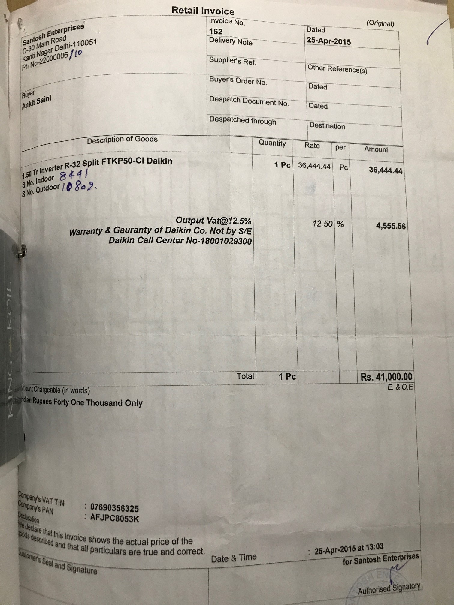 So! now, I have no option left other than posting my story online so that atleast other consumers are not cheated and looted by Daikin & should take a decisive call before thinking of buying a Daikin product.