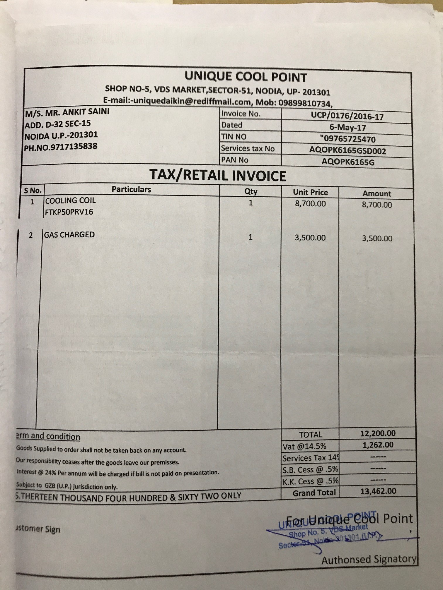 Came summer 2017, I called same service engineer from Daikin and he quoted Rs.8, 700 for cooling coil. He said he'll fill gas for free as he was the one who filled it twice last year & he'll place an order with Daikin warehouse for new Coil on my behalf and will call me back when he has one. Week passed-by without any response. I called again and he said there's no Coil for this AC in their repository as this model is out-dated and he'll call back as soon as he get one. Another couple of days went by without any response. I called him again. He said, he still doesn't have the coil & no news on when he'll get it. My frustration was increasing with soaring temperature and I called Daikin service center. They logged in my complaint and assured me that someone will get back to me. Couple of days passed by and no one called. I called again, and to add to the trauma - they did not have any records of me, nor my complaint. I again got my complaint logged and provided all the details. After couple of days I called again and voila! - they still did not have any logged complaint and had no records of me. Upon showing some frustration - customer support executive told me that there must be some technical problem due to which your profile is being deleted or something! Anyways, I again got my complain logged. This time I got a call from Noida sector 10 service center. They quoted Rs.10, 500 for cooling coil & Rs.3, 500 for the gas recharge+ 14% VAT extra. According to them, these were company charges. I declined as previous engineer had quoted me less. When I told him the same, he asked for the previous(Abdullah's) contact number and cursed him on phone for quoting less. He said, that Adbullah is lying and he doesn't know anything. I mailed Daikin customer support and told them about misleading quotes. No reply for a few days and then I again called them back and then they transferred my complaint to another service center. Now, Mr. Hansar Khan from Sector 51 service center gave me quote of Rs.8, 700 for cooling coil & Rs.3, 500 for gas re-filling+ taxes. Finally, after 1.5 months of chaos - on 6th May, 2017, an engineer from sector 51 service center came and replaced the cooling coil. I was happy that AC was working finally & hoped for no more breakage.