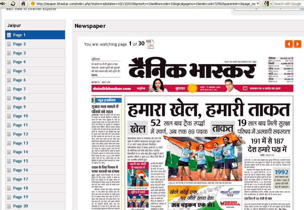 This E paper has sixteen regional editions, as for example Jaipur edition, Chandigarh edition,Bhopal edition etc. It has option to save the paper in an impressive PDF format too. Just save pages and enjoy later on. The quality of the print is beyond comparison to any news paper, if you happen to see on any LCD screen..... It soothes your eyes.........very pleasant indeed.