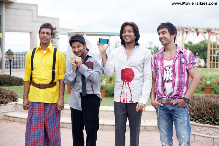 Talking about the performances, Sanjay Dutt comes up with a very natural but restrained performance which gets overshadowed because of the four jokers! Riteish Deshmukh yet again proves that his comic timing is unbeatable! He also gets a chance to showcase his mimicry scenes. His imitation of Sanjeev Kumar and Aamir Khan is just outstanding! Jaaved Jaafery was the next best and it’s great to see how he comes up with a performance like this with ease. Some of the best dialogues are reserved for him! Arshad Warsi too was efficient and looked damn cute as the sardar! Ashish Chowdhry doesn’t get much scope in the first hour but scores when he comes in the disguise of a chimp and later as a woman!
