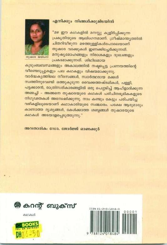 On the minus side, the stories may need little more drama in some of them. Also the author should attempt to portray different spheres of life to the readers. *Veteran writer, S Saradhakkutty had mentioned that in the absence of criticism literature takes an early death. I wish the same don't happen to such a talented writer like Thushara James.* The writer is a genius in her own right where she was selected as best law student of India and represented India in many international competitions. Writing is a new war front for her, probably she considers it as a second front, but....if the talent shown in this story collection, 'Enikkum Ningalkkumidayil' is of any hint, it is a great attempt and announces the arrival of such a nice writing style and a thought process. Look forward to read more from Thushara James.