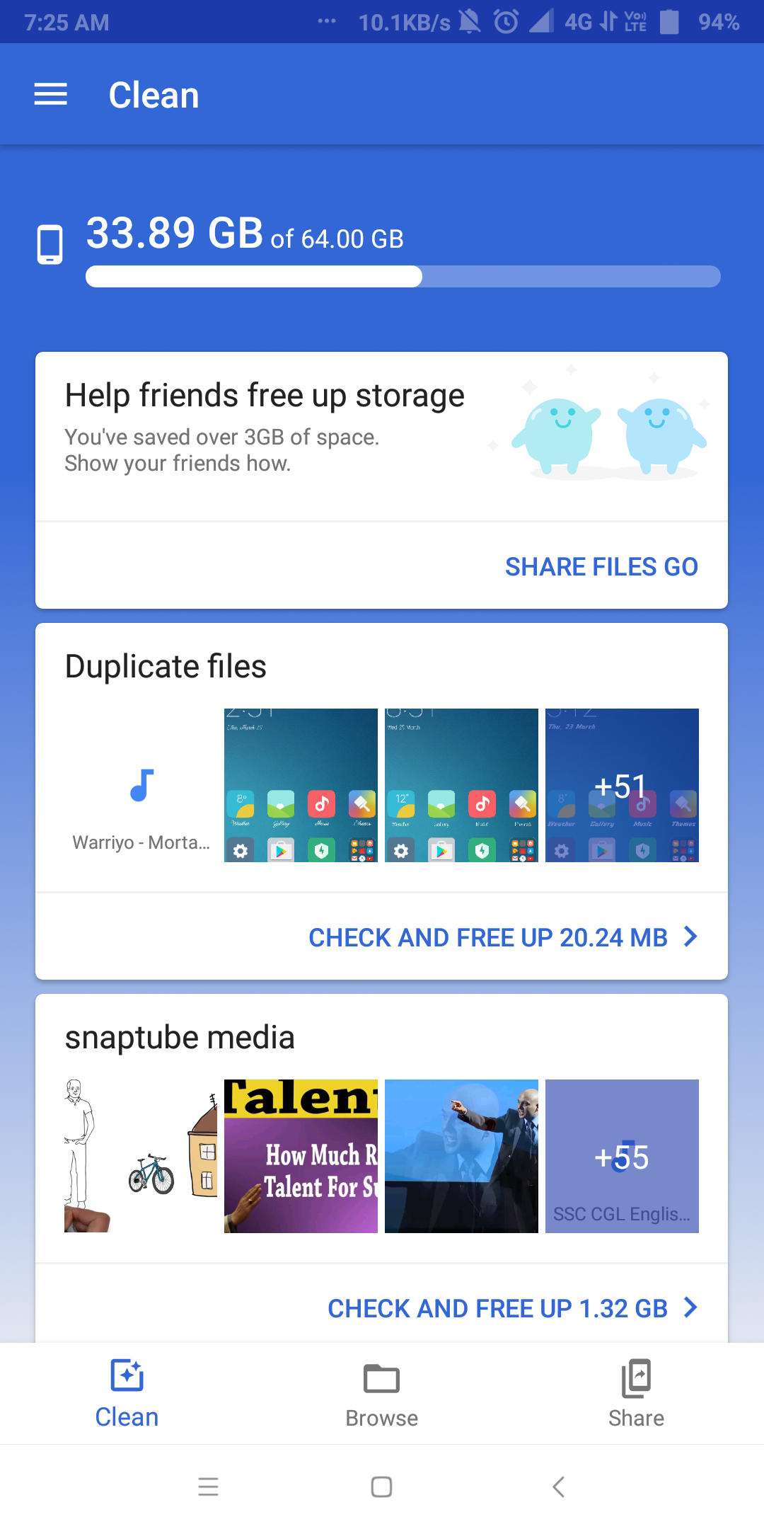 Files Go identify two different movie files on my micro SD card as trash and prompted me to delete them . I keep several movie for free time so I rarely watch them . This awesome file manager app easily clean the trash . So I satisfied on it .