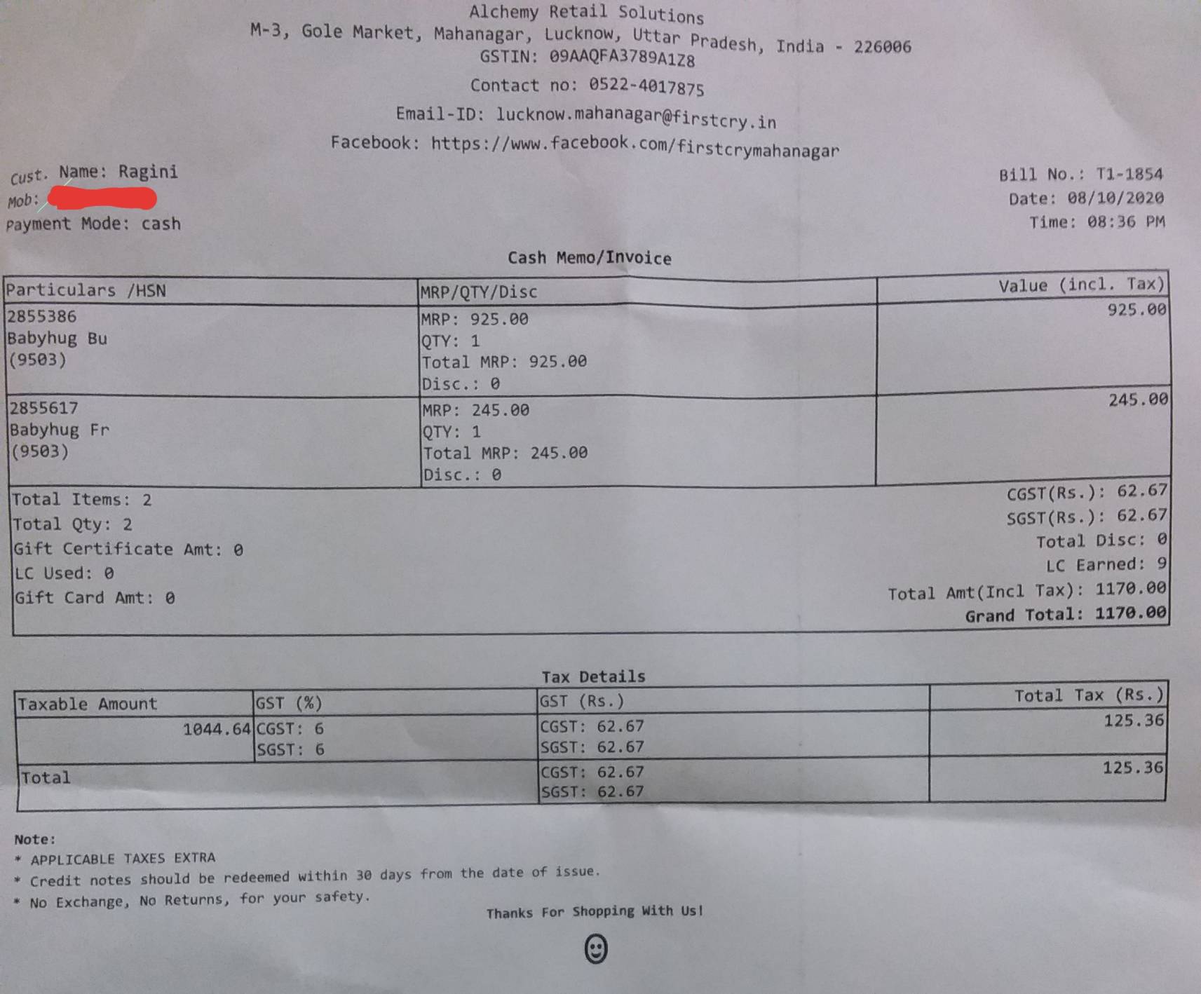 I have gone to first cry store mahanagar Lucknow and the staff told that there is discount of ten percent on all the toys. i have selected few toys and asked for the bill. The staff told to pay the amount and told the bill will be generated after bill. i got bill after 5 minutes after i have made payment and there was no discount at all. After enquiring about the discount i got reply that the discount was on selected toys. these peope who are managing the store are cheaters. These types of unethical people are damaging first cry image.