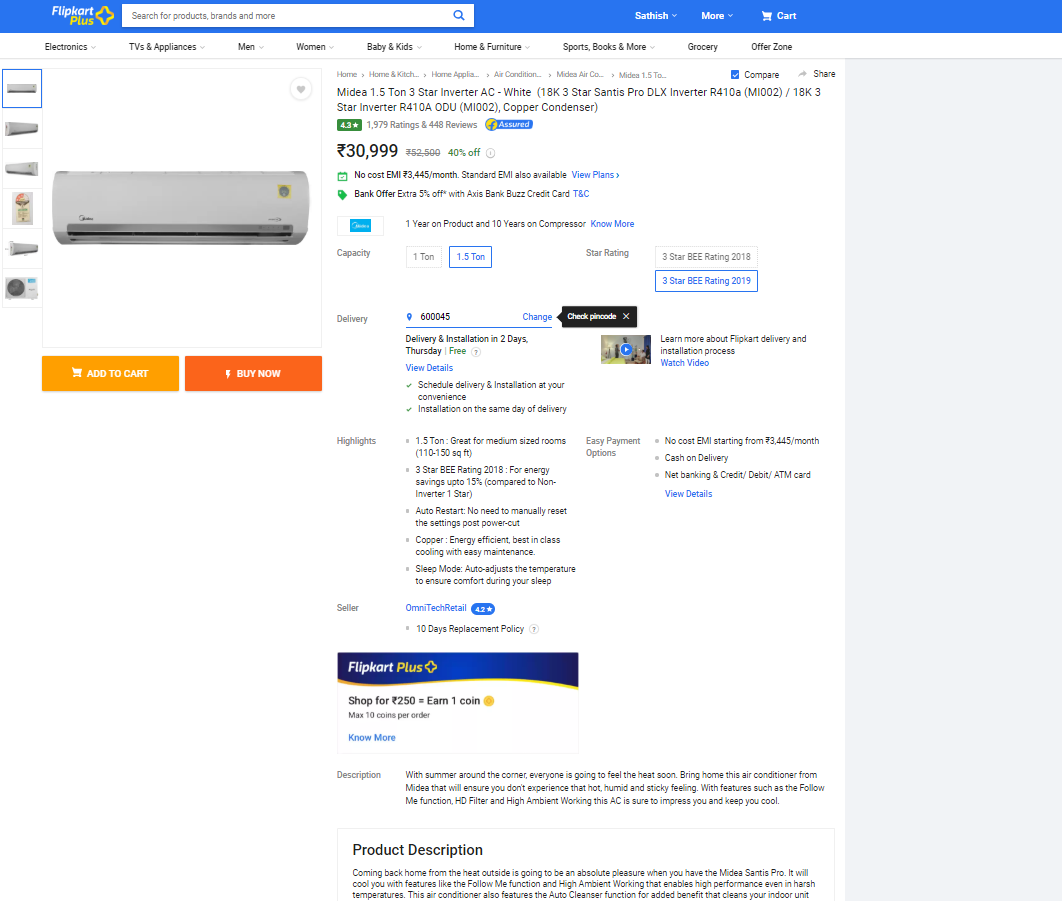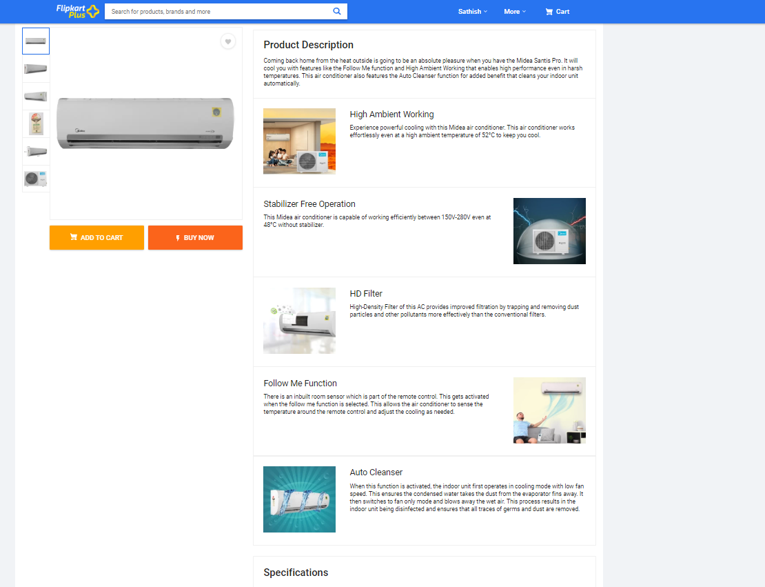 I have ordered for CarrierMidea Airconditioner(Midea 1.5 Ton 3 Star Inverter AC - White(18K 3 Star Santis Pro DLX Inverter R410a(MI002) / 18K 3 Star Inverter R410A ODU(MI002), Copper Condenser) on 7th March 2019 from Flipkart and got it delivered by 10th March and Installed on 11th March 2019, as the product description says that it comes with a lot of features like Follow Me Function, Auto Cleanser etc, after installation I enquired on the above-listed features, the service guy from CarrierMidea told me that there is no such feature in this AC, they also confirmed from the local office .