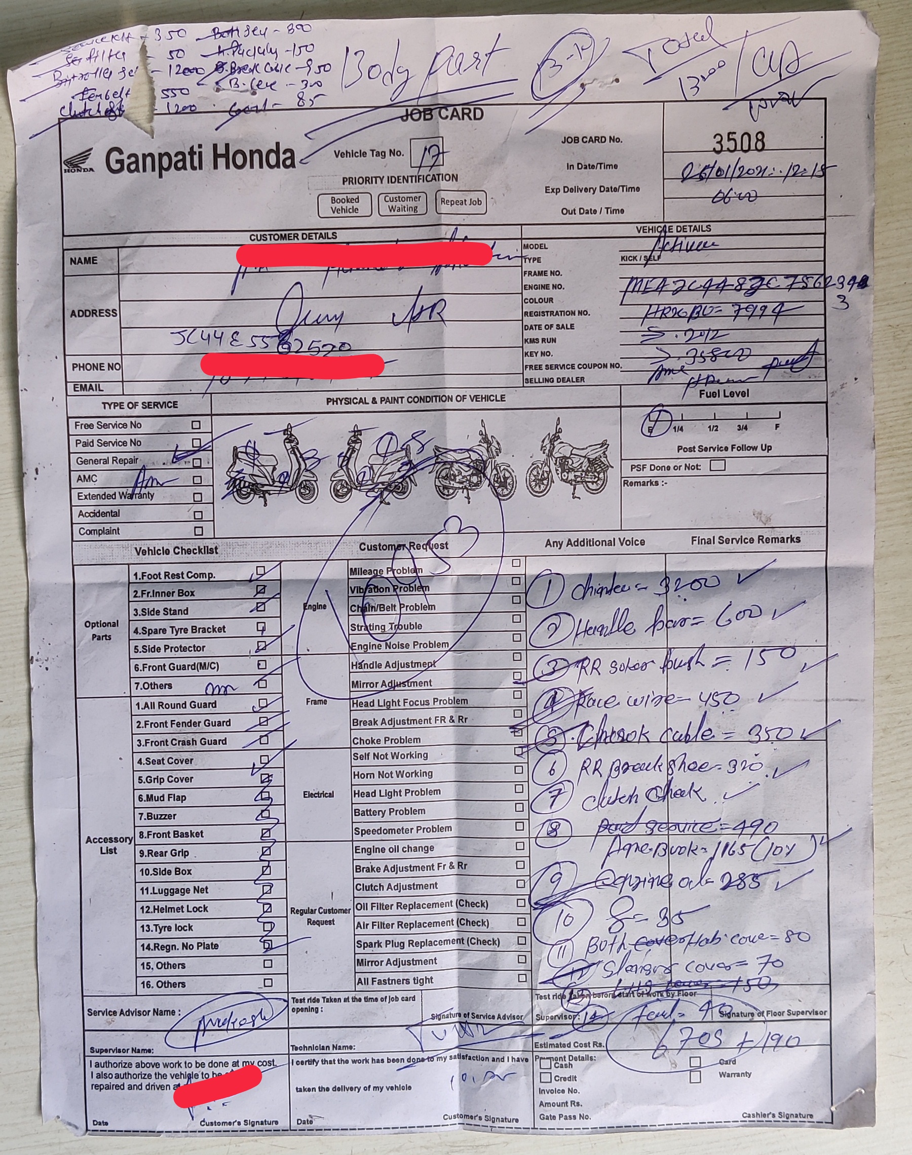 On my visit at Ganpati Honda, Palam Vihar on 25th January 2021 for service and other maintenance issues for my Honda Activa. I asked them very specifically to check the vehicle thoroughly and let me know every possible issue that they as professional technicians can observe.
