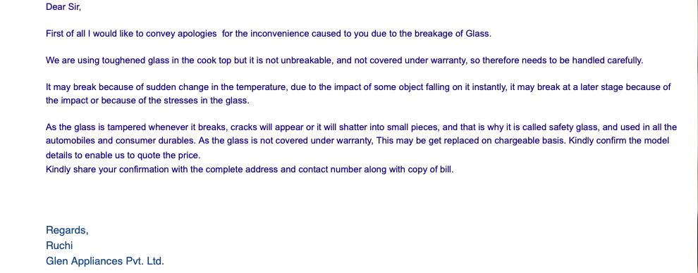 We bought a Glass Gas Stove from GLEN Official Store. It has been 2 years and the Glass Burst or I would say EXPLODED(Because the sound produced was equivalent to an explosion and Glass pieces fell as far as 8 feet away) all by itself around evening even when the Stove had been in Off mode since 7 AM in the morning.