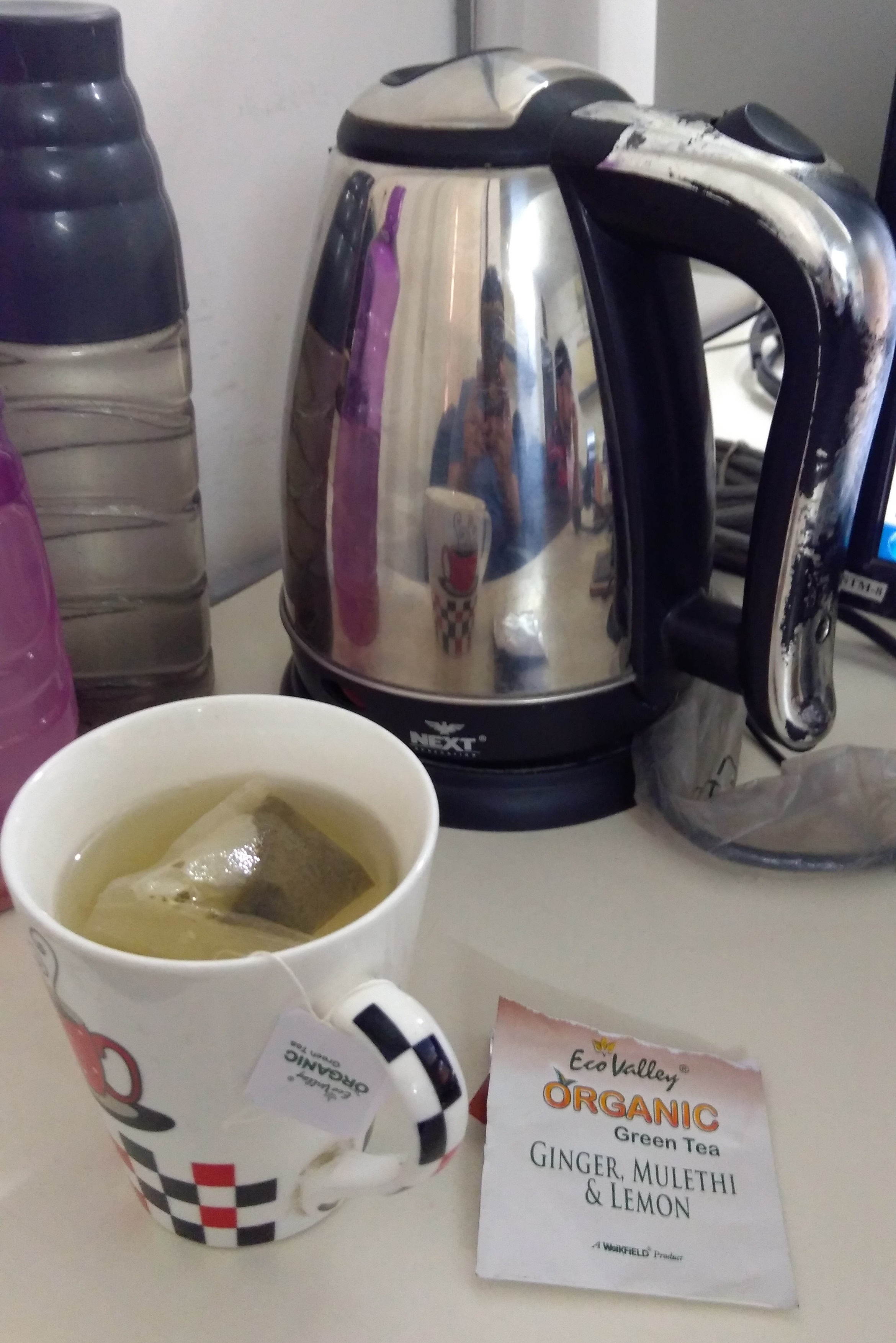 From past 3 to 4 years, I am consuming green tea 4 to 5 cups a day. I used brand “Eco Valley Organic Green Tea”. It contains main ingredients Ginger, Mulethi & Lemon.