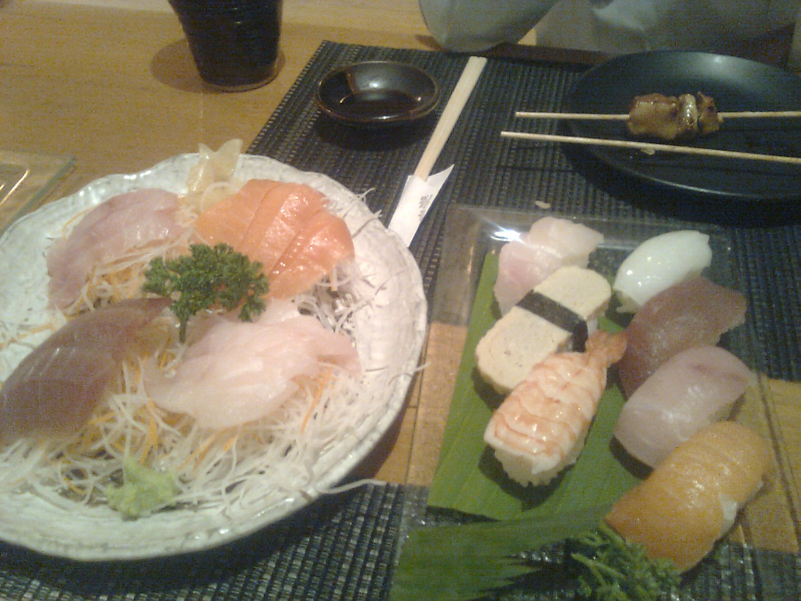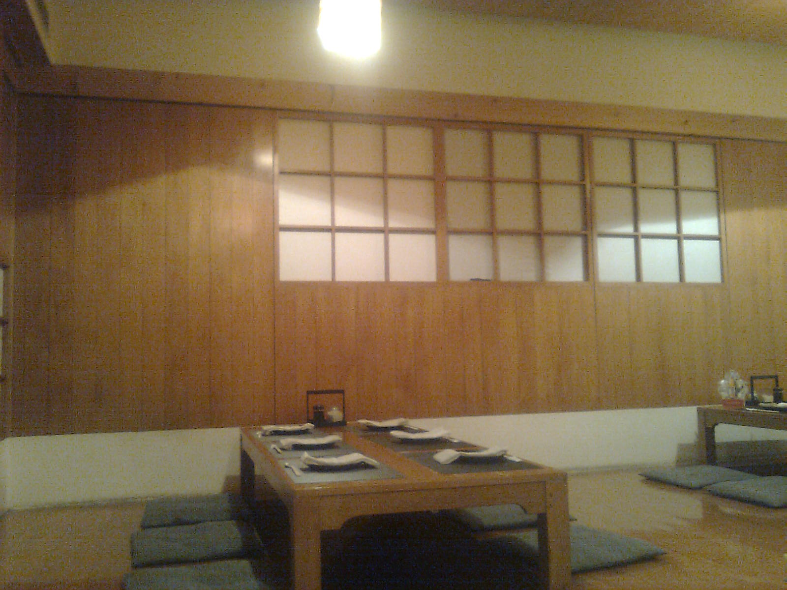 Ambience - Awnings marked with Japanese alphabets and a sliding door marked the entrance. We walked past the bar area and were led to a table. The overall ambience was sufficiently elegant and made a little noisy by an animated quartet of Japanese patrons.We spied the Tatami room tucked away in a corner,and asked to be seated there. Before this we were given cool scented towels to wipe our face- I was shocked to note that my towel was speckled with black -the result of a bike journey through the unregulated urban hell that Bangalore has become. Anyway, we stepped into our chosen locale- four tables each less than a foot high were arranged in this compact mood-deepening sanctum illuminated by square lanterns. Gleaming light brown wood liberally comprised surfaces ,and wooden latticework covered off-white screens. I sat cross-legged on the cushions, before realizing that just under the low table there was a big hollowed-out pool of space into which one could leisurely suspend the legs.The city and everything outside the room were shut off and we were alone. A beautiful Geisha would have perfectly completed the atmosphere but nevermind we were still happy and expected the food to provide the required seduction.