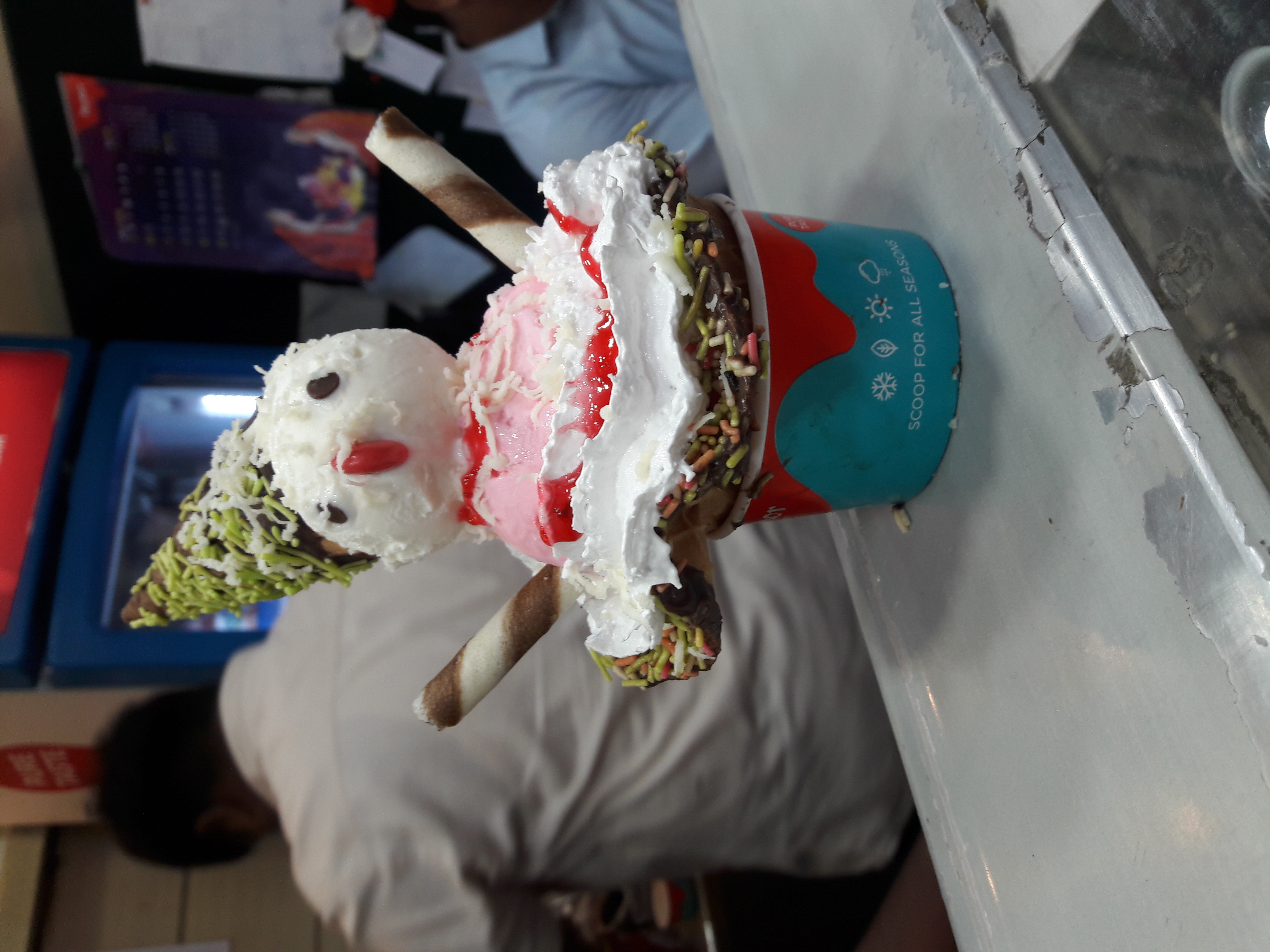 The Sundaes are a classy affair here. You can choose from The Terrific Treat, The Taco Twist & The fruit overloaded which are their signature brands or from The Hot Fudge Nut, The Belgian Sensation or The Oreo Overloaded. Since, I wanted to try the winter special sundaes I gave a yummy treat to my taste buds with the Gulab Jamun Sundae, Sizzling Brownie Volcano & not to be be missed out at all Season’s eating …The Christmas Special Snowman Sundae .The Gulab Jamun Sundae was a great effort to bring a touch of Indian Mithai to the Icecream . The Snowman Sundae was truly not only a visual delight to live up completely to it’s name Sundae but amazingly tasteful. Thanks Santa HAVMOR for The Snowman Sundae.