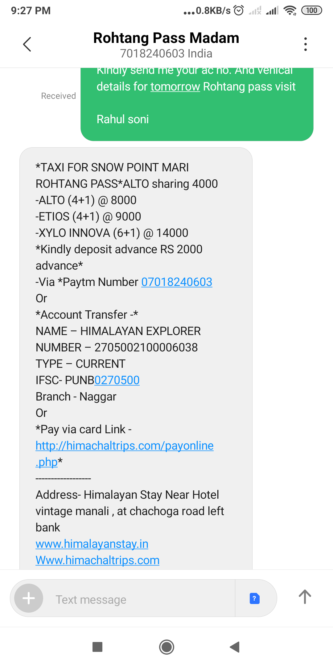 for which I was online transfer 2000 rs as booking amount on 12-06-19, after confirmation there called me by 9 pm and informed we will go to Rohtang pass by tomorrow early morning(4 am) so that we will reach between 10 am to 11 am, so that full-day we will enjoy the snow and other adventures,