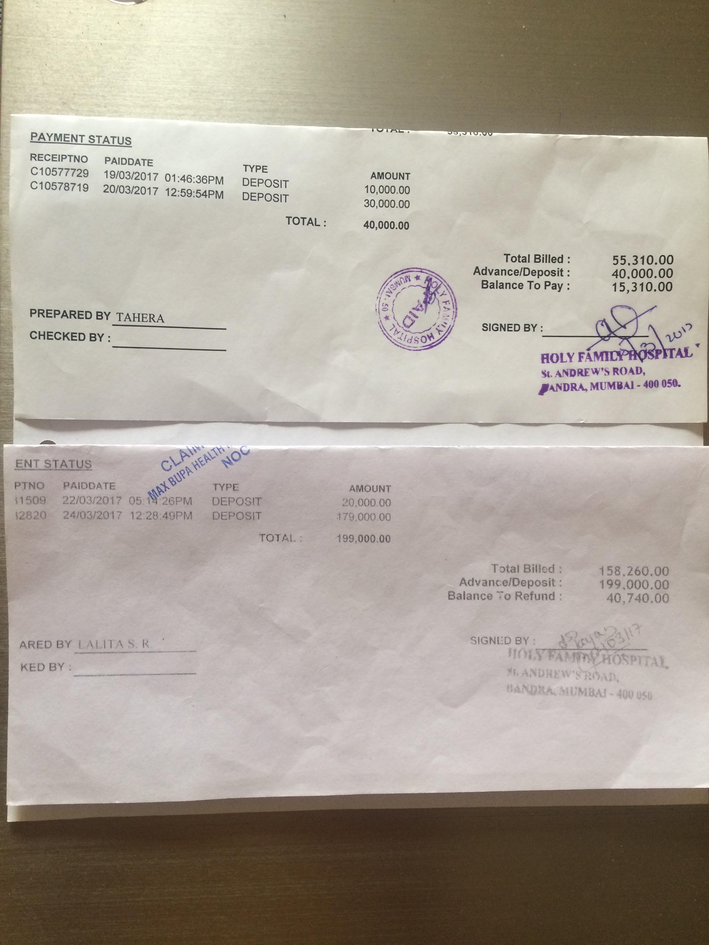 Holy Family Hospital, Bandra has made a ‘False Claim’ that Rs 40,740/- was paid in cash on 27.3.17, which itself contradicts their ‘Policy’ & ‘Notice Displaced on their Cashier Counter’ after Demonetization(Refer attached photo). There is neither a ‘Refunded’ Stamp on the Invoice nor a signature and date of the Cashier( which is normally done after stamping).
