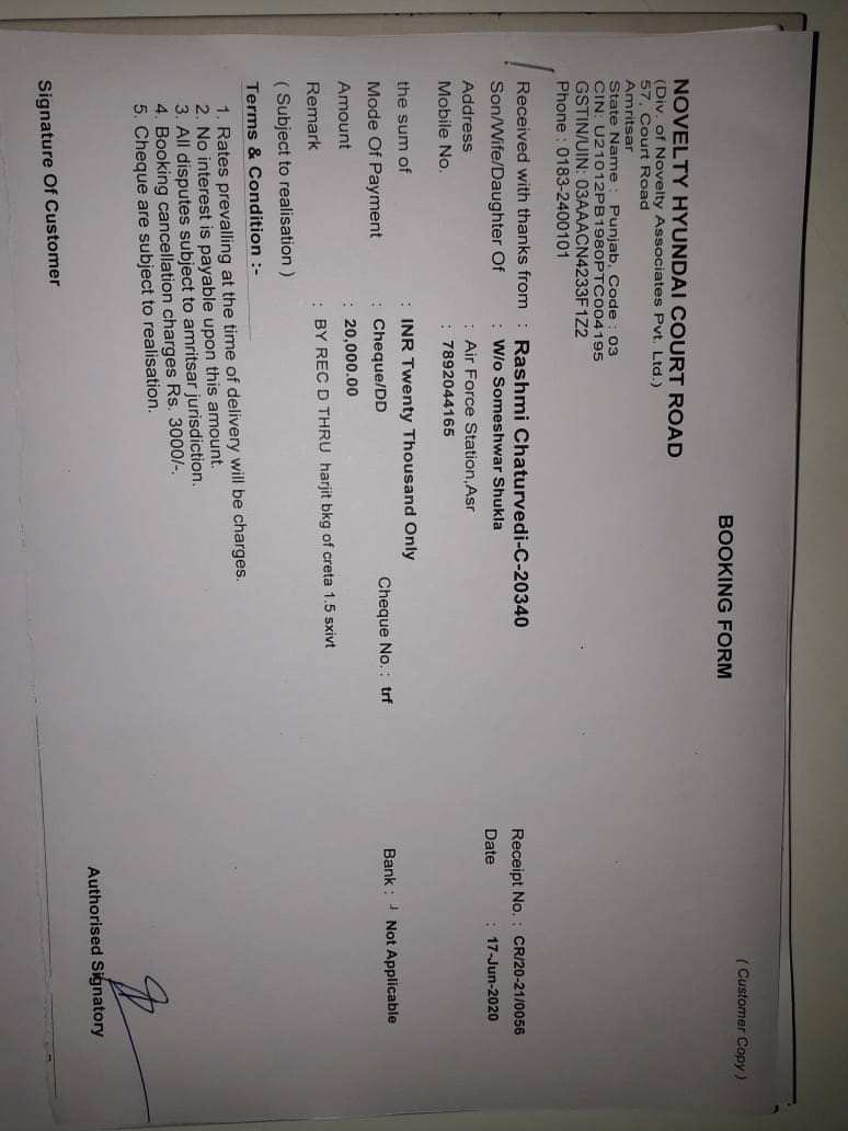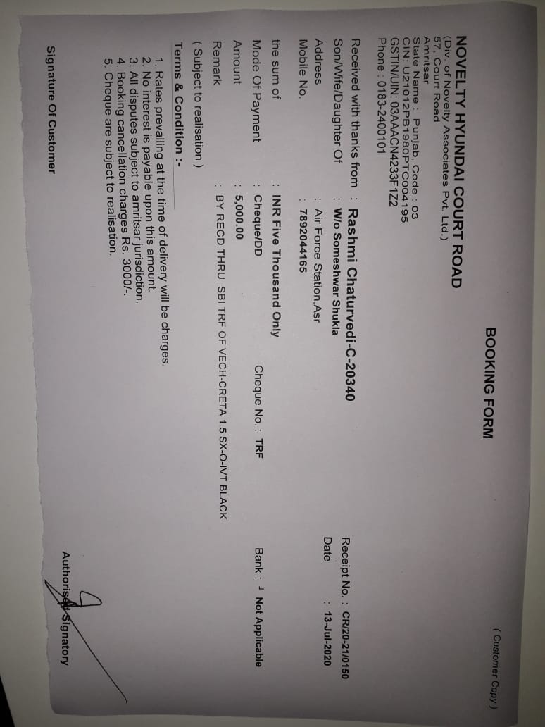 I wish to inform you that I and my wife are serving in Armed Forces and we have booked Hyundai Creta 1.5 SX(O) IVT Petrol from Novelty Hyundai Court Road Amritsar in the name of my wife Capt Rashmi Chaturvedi. (Booking Details attached).