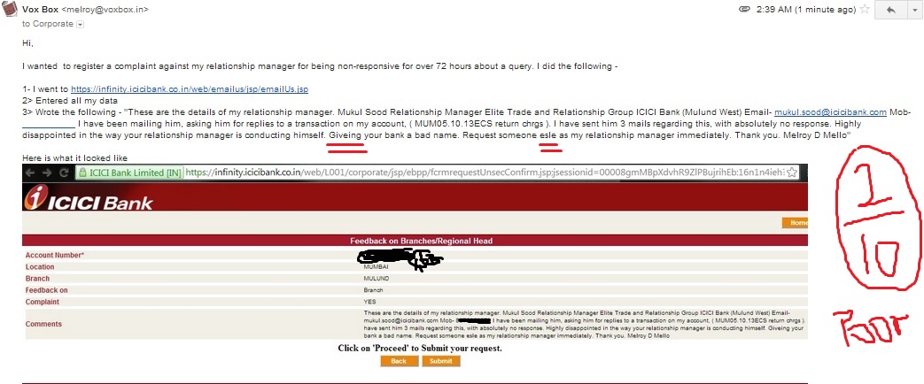 3> Wrote the following - "These are the details of my relationship manager. Mukul Sood Relationship Manager Elite Trade and Relationship Group ICICI Bank (Mulund West) Email- mukul.sood@icicibank.com. I have been mailing him, asking him for replies to a transaction on my account, ( MUM05.10.13ECS return chrgs ). I have sent him 3 mails regarding this, with absolutely no response. Highly disappointed in the way your relationship manager is conducting himself. Giveing your bank a bad name. Request someone esle as my relationship manager immediately. Thank you. Melroy D Mello"