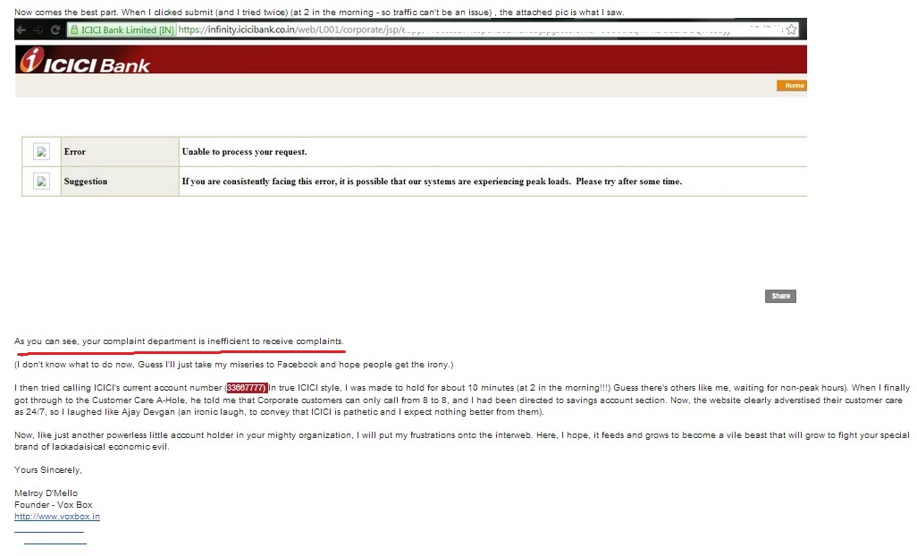 I then tried calling ICICI's current account number (33667777) In true ICICI style, I was made to hold for about 10 minutes (at 2 in the morning!!!) Guess there's others like me, waiting for non-peak hours). When I finally got through to the Customer Care A-Hole, he told me that Corporate customers can only call from 8 to 8, and I had been directed to savings account section. Now, the website clearly adverstised their customer care as 24/7, so I laughed like Ajay Devgan (an ironic laugh, to convey that ICICI is pathetic and I expect nothing better from them).