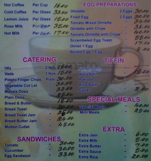 Cold coffee is also available, served in a Yera glass (also ancient). It tastes good, sort of a homemade feel to it. Rs. 33 per glass. What I normally have as food when I come here varies between the bread toast with omlette, or the plain and simple masala dosa. Bread toast or bread butter with an omlette or scrambled eggs are one of the popular combinations to have here. However, they never seem to have the tomato omlette. So Plain it is then. Nothing remarkable, but you can never go wrong with a simple bread and egg. Together, they cost around Rs. 50.