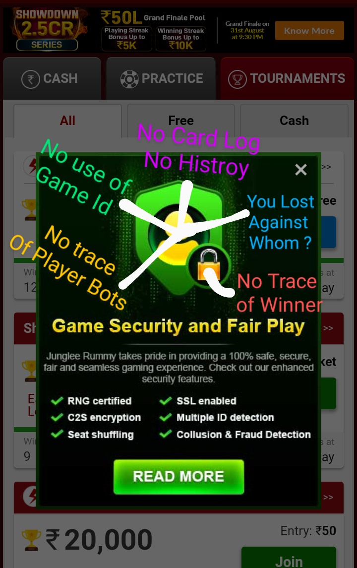 3) Every game log should be maintained and every user must have access to it. As its their right to know the genuinity. For cash money against whom they have loose or win. Ex a user can enter tournament I'd number and he can view card points & other user profile details etc.