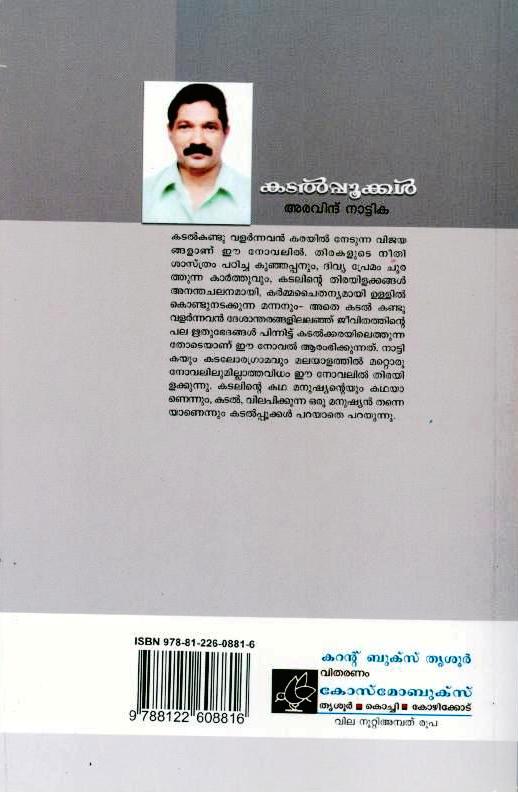 There are not many books published in Malayalam with real sea experience and Aravind Nattika's Kadalpookal is a welcome relief. The novel may be not that great if you consider for its dramatic presentation or the story. However, no one can deny that the author painted an excellent background and the characters are projected as its bright reflections.