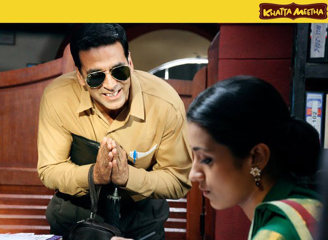 Khatta Meetha begins wonderfully with Akshay Kumar singing bhajan that sets the mood. In the next 20 minutes, almost all the important characters are introduced and frankly, this is done in a decent and not haphazard manner. The entire bridge collapse accident episode deviate the film from its actual plot but was well treated. Funny scenes, although not many, stand out and provide ample laughter. The entire road roller-Johny Lever sequence was howlarious and brings the house down. Equally funny was Asrani talking to multiple people simultaneously…damn funny sequence! However, as mentioned before, the film isn’t completely comical and deals with lots of serious issues in a, well, serious manner. The film could have given a strong message which unfortunately doesn’t happen. What you get in the end is a film that’s partly-funny as well as thrilling, action-packed and dramatic! In short, a bhelpuri of various genres!