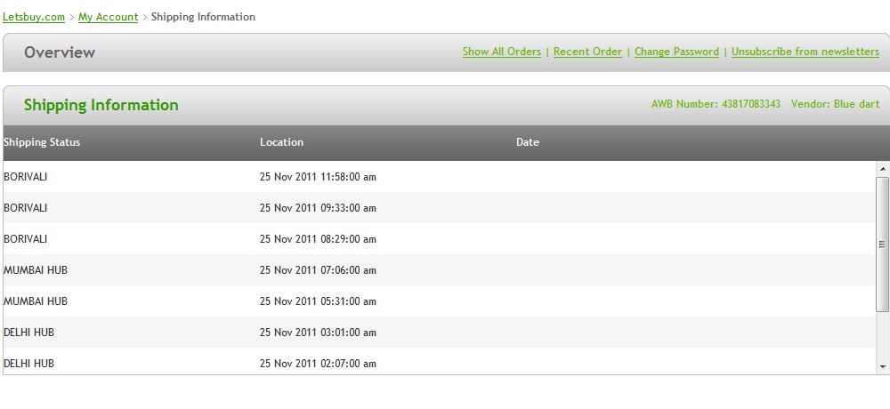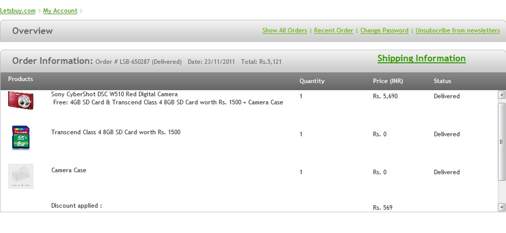 After that I started searching about the reputation of letsbuy.com . I found that everywhere people are writing LET'S NOT BUY FROM LETSBUY.COM. So I was little scared after reading those negative reviews of letsbuy.com. Meanwhile one of my friend gave me a coupon code of letsbuy which is of 10% discount(thanks to my friend) . I applied that coupon code(AMEXLB) on that product and now the price of camera was Rs. 5121(in my budget almost). I crossed my fingers and proceed with payment on 23rd Nov 11:58AM( Order # LSB-650287). Exactly within 48hrs(25 Nov 2011 11:58:00 am) I got my sealed pack camera with all accessories.