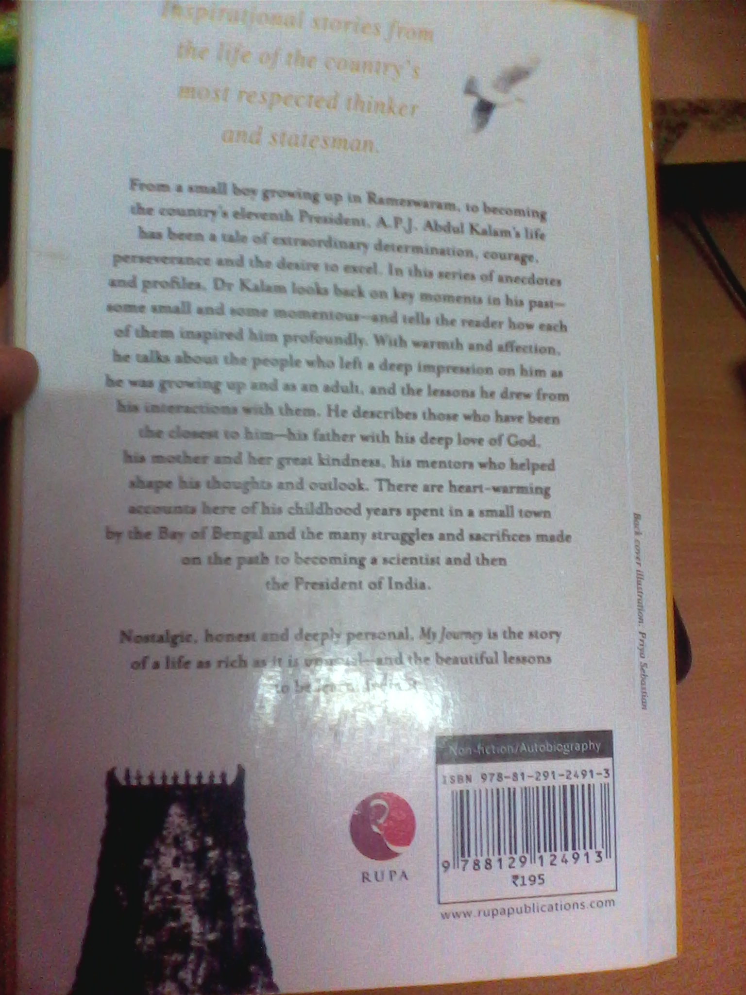 Hiii, I have bought A.P.J Abdul Kalam My journey last month in the Rs 195 . It took me only half month to read this book because book is not so lenthy, their I approximately 140 pages are their, in this book Kalam Sir tolad about his child hood memories in which he used to help his cousion brother Abdul jalaludin in work of paper distribution in the early morning after that he told about how he get admission into IIT and what His role in the Making SLV-3 for the nation and How he become the President of India .