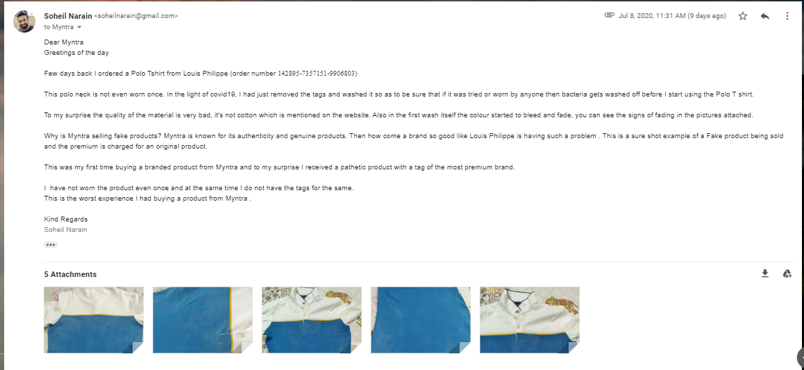 During the lockdown I ordered a #Louis Philippe Polo Neck T shirt from Myntra(order No. 114289573571519906803). Because it was Covid19 so I thought of giving the T shirt a wash before I even try or wear it, just to be sure of hygiene factor. I think this is what everyone would be doing.