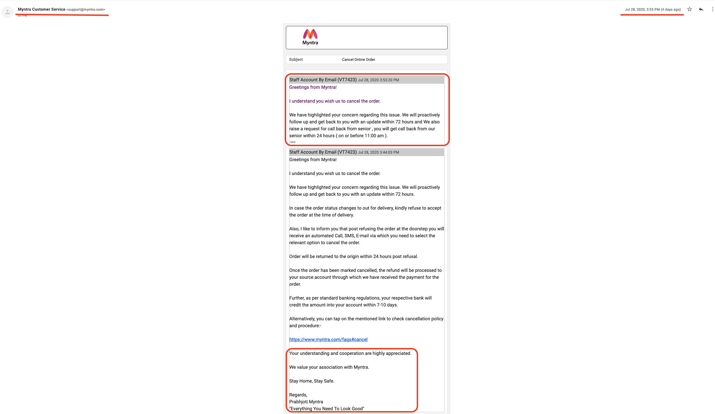 18) By the end of that day, I had to reach out to the @MyntraSupport / #myntrasupportteam once again, to confirm if the order is now canceled, and if not then why not, to which they again now did not have an update. Now they said that I need to wait for an Automated Call to Cancel the Order. They still can not Cancel the Order and it can only be done via that Automated Call. Again upon multiple requests, the executive named Jayshree arranged for a call from her supervisor to provide me an update on this matter, which she can not. Also, as earlier, she can not prioritize this matter and get me a solution to all this nonsense right away.
