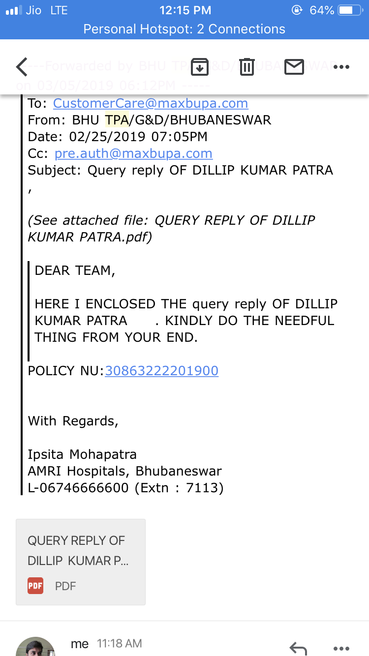 Attached are the proofs furnished to confirm that the hospital had provided response to queries from 25.02.2019 itself with repeated reminders addressed to Max Bupa. Max Bupa’s response after the incident was highlighted on social media, fraudulent response to the claim rejection which isn’t mentioned in hospital response and forcing me to sign an exclusion in the policy and threatening to dismiss the policy and forfeit the premium if I don’t abide to their rules.