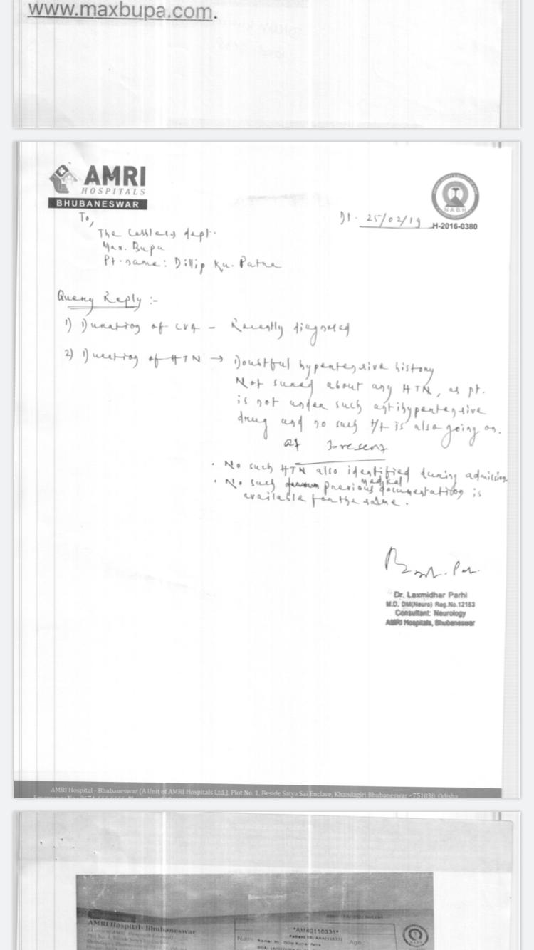 My father was admitted to Amri Hospitals, Bhubaneswar on 16.02.2019 following a sudden brain stroke. As part of the cashless claim, I had already informed Max Bupa about his admission. Max Bupa raised queries regarding his HTN which were responded by the hospital on 25.02.2019. However Max Bupa had rejected the claim themselves and hadn’t communicated about the same either to me or to the hospital. When we contacted them regarding the response, they mentioned they had rejected the claim but didn’t had any answer as to why it wasn’t communicated.