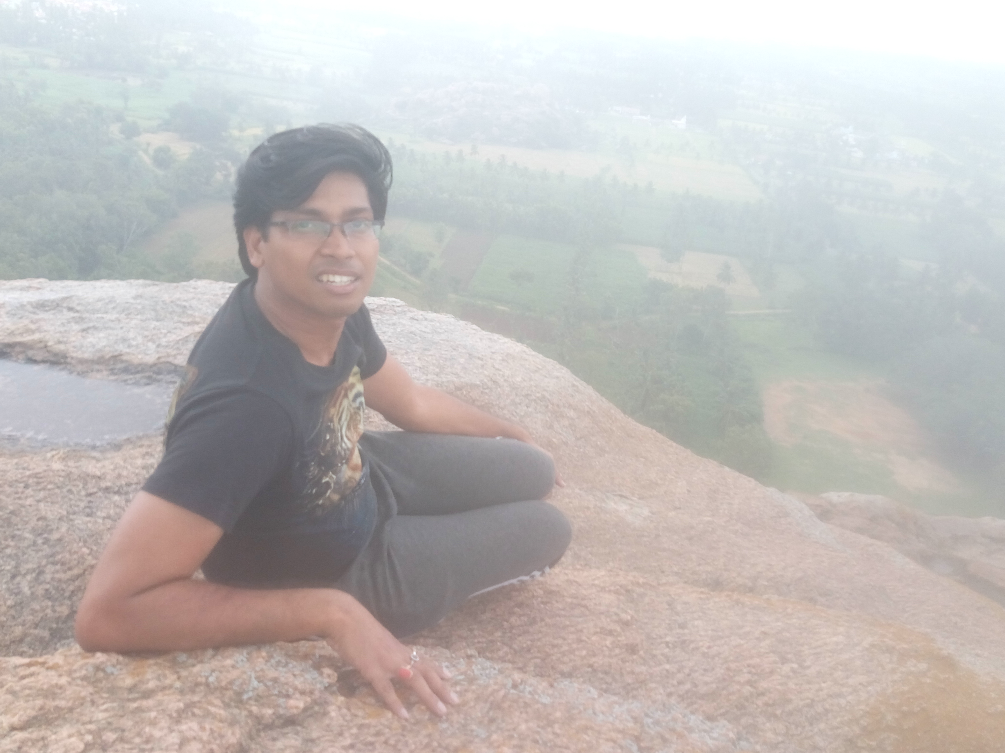 At this point, I also called out to the 2 others who had paused earlier, gazing at something. After a while, they appeared to call back from a distance and as their voice grew louder, I became sure they were coming along the same route. Just to avoid confusion. With that, I moved ahead again and was eventually joined by the 2 others who were also coming along. We appeared to have reached somewhere near the top. But just straight ahead, we saw 3 women standing and chatting at an altitude, slightly higher than us. From our vantage point, it appeared to be the highest area on the hill. Wondering what these gals were doing in the middle of nowhere, atop a hill, we also moved ahead to our intended destination. Just as we were about to climb the final rock though, the 3 girls I mentioned, seemed to disappear just behind the huge rock which appeared to be the highest point. A bit flummoxed, we moved on to discover that there was a narrow path (appeared just enough for 1 person) around the rock leading to a short opening from which there was a climb of another 2 -3 large rocks, the last one also having a short gap with the closest adjacent rock. Above that, was the highest point of “Onake Betta”. Around the narrow path was a steep fall, so I did that part, a bit cautiously. Once out in the opening it lead to, I used my own sense of whatever appeared to give me the right balance with my style and instincts to get to the highest point in a continuous series of swift movements.
