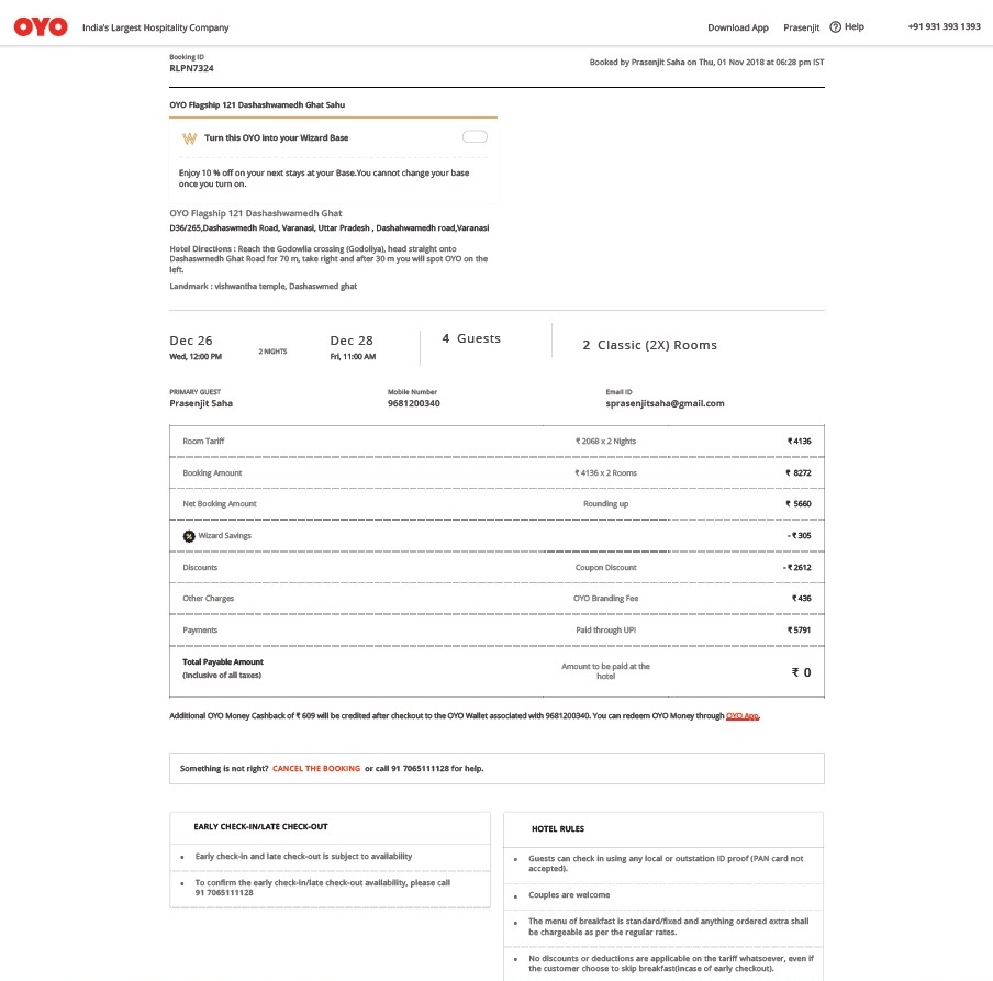 1st November, 2018 I booked hotel Flagship 121 Dashashwamedh Ghat Sahu via OYO through UPI, full paid Rs. 5791/- for 2 classic(2x) rooms from 26.12.18(12pm) to 28.12.18(11am) invoice enclosed(Booking ID RLPN7324).