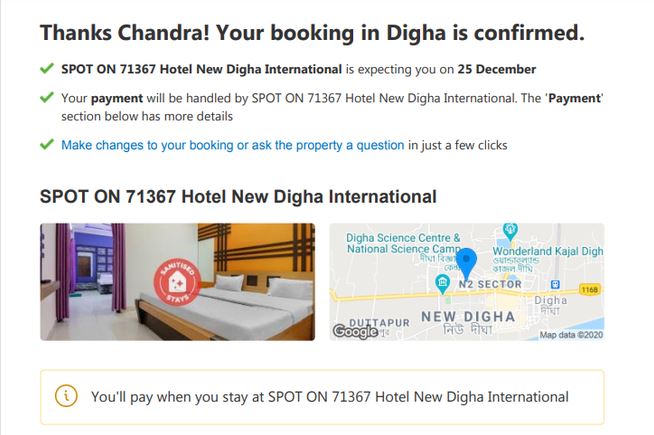 OYO assigned me a hotel in Digha and sent me an SMS to make payment to confirm the booking. The hotel name was "SPOT ON 71367 Hotel New Digha International"(screenshot attached). I made payment through internet banking and went to the hotel in Digha with my family.