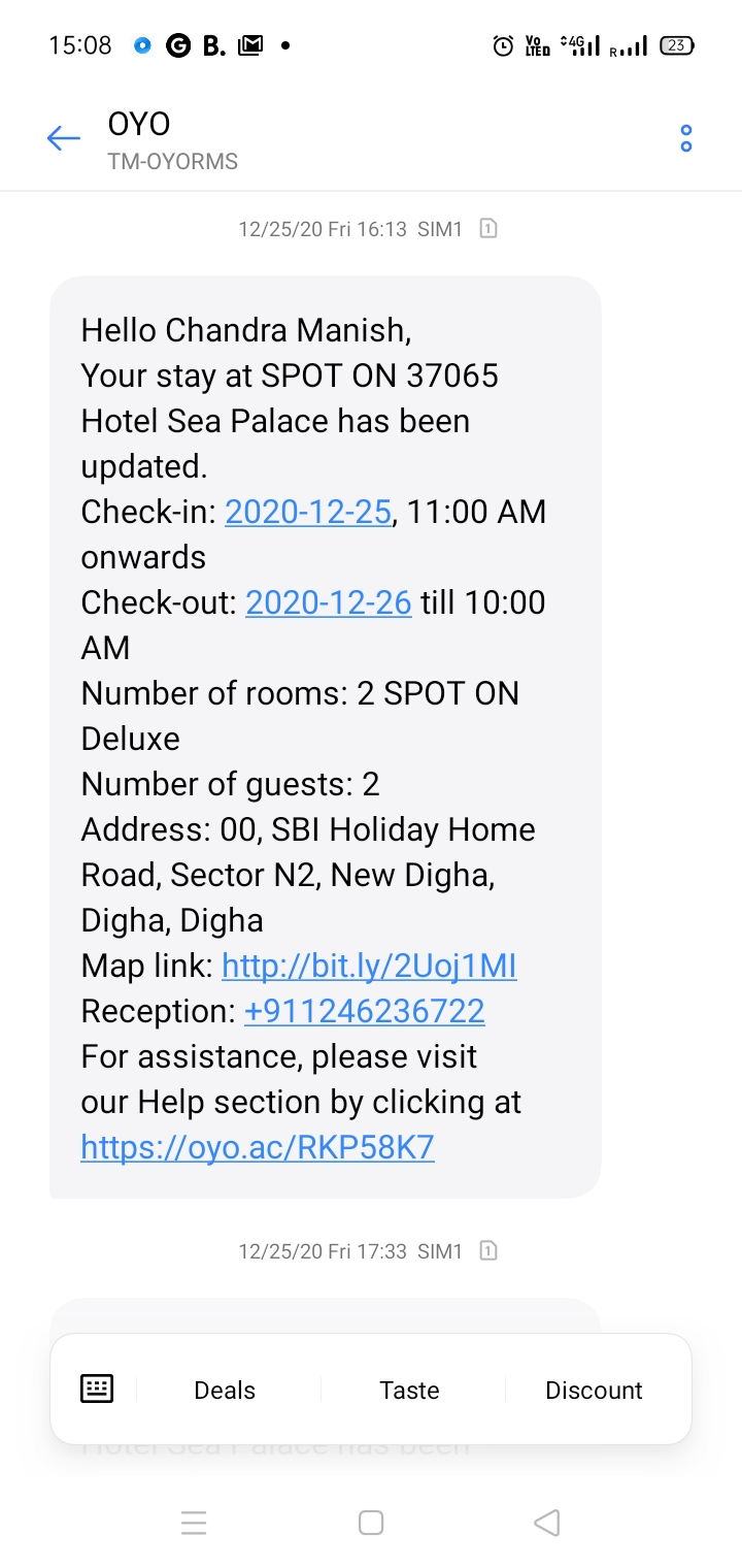 Finally, after some time I received a call from OYO customer care. He said sorry and said that the hotel detail has been forwarded to my mobile. I said I already have details on email when I made bookings. Then he said that hotel detail has been updated. I was shocked that after so many hours they updated hotel details without my consent. I made a booking after checking the hotel condition online and they assigned a new hotel 4 hours after check in time and that too without my consent. And my family was suffering because of them. My baby was continuously crying which made me feel frustrated and bad and I got angry as well. But I had no option. I was new to Digha So I tried to follow the location of the new assigned hotel that was sent over SMS(screenshot attached).