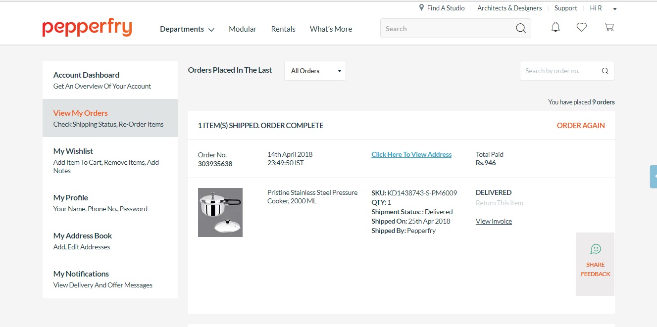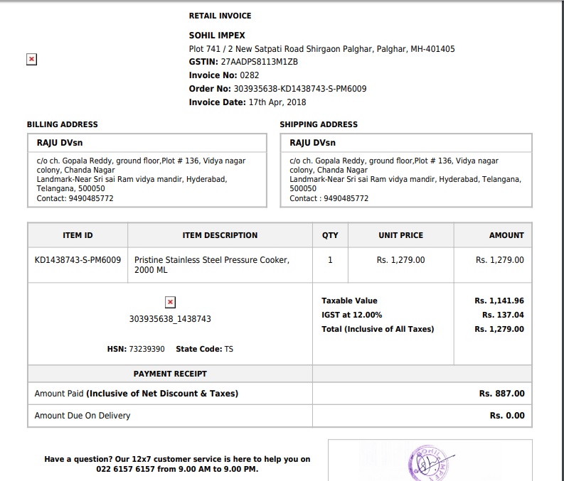 Order No. 303935638 on 14th April2018. After receiving the product there is no lid, asked for return they said they could not take return. I have asked why you have showed the lid in the image( they do not mentioned the lid is not the part of product). Many of the people do online shopping by viewing the image. In pepper fry there is no reviews or rating about the product. I have paid Rs.946 but invoice I have received was rs.887.(proofs attached images)