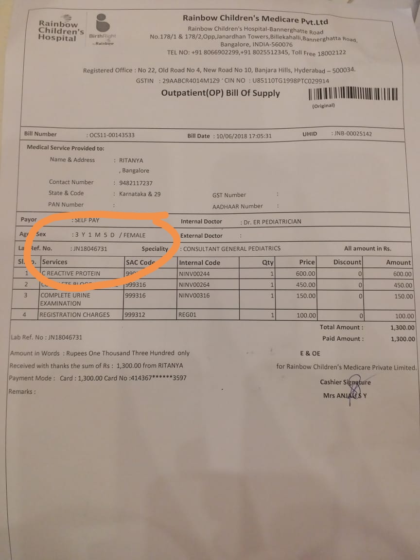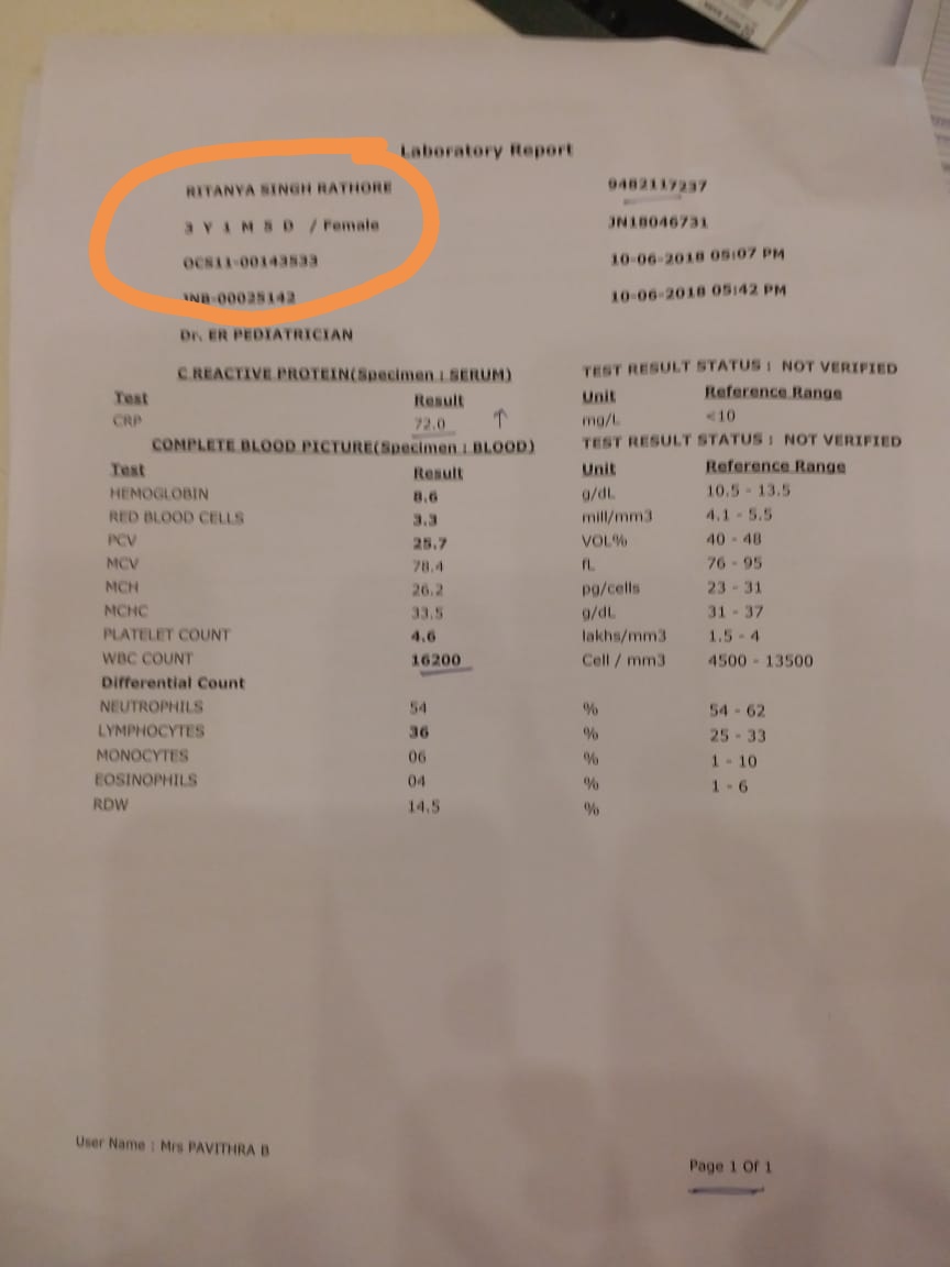 Hi friends, want to share something which has happened yesterday with me and my daughter. we went to Rainbow Hospital as my daughter was having high fever past 5 days and we took her to emergency. They did the blood test and after report came they ask us to immediately admit her in the hospital as her c-reactive protein content was very high. we ask them to give some time to take the decision. while me and my husband were discussing, I suddenly notice that the age which was mentioned on the report was wrong. my daughter has just completed one year on 5th and the age written on the report was 3 years 1 month and 5 days. I was shocked to see that and went to reception to clarify how this mistake has happened and she told me mam while registration by mistake I have put a wrong age. I immediately asked her to contact the labortary and ask them that whether blood sample used for investigation was of my daughter or some 3 years old child? after that some admin guy came and apologize for the big Blunder. he said madam we will correct the report, the blood sample is of your baby only but the reference range we have taken of 3 years old child which we will correct it now and we will give you a new blood report. my husband was out of his mind and he shouted on them asking that how can we rely on this report now when the reference range for the blood investigation has been taken wrong. friends, the same thing has happened while my pregnancy 2 years back when I got the news about my conceiving, we First went to Rainbow Hospital in my 7th week. I met the doctor and doctor ask me to go for a scan and in the prescription a very small note she has written check for short cervix when I got my scan report my scan doctor informed me that my cervix is short. I had no clue what does that mean so when I consulted the same doctor again he said after completing 3 months you have to go for a small procedure where we will put a stitch on your cervix so that it won't open up. Another week went by and I went to Cloudnine hospital just for taking a second opinion and when I got my scan done, I have been confirmed that there is no short cervix and I have no problem in my pregnancy, I've got a very healthy child without any procedure so these things I am sharing you just to make you aware that I think Rainbow Hospital is a newly setup hospital and their are behind money, it is just my opinion. I am attaching my daughter's reports under this message you can yourself check. thank you