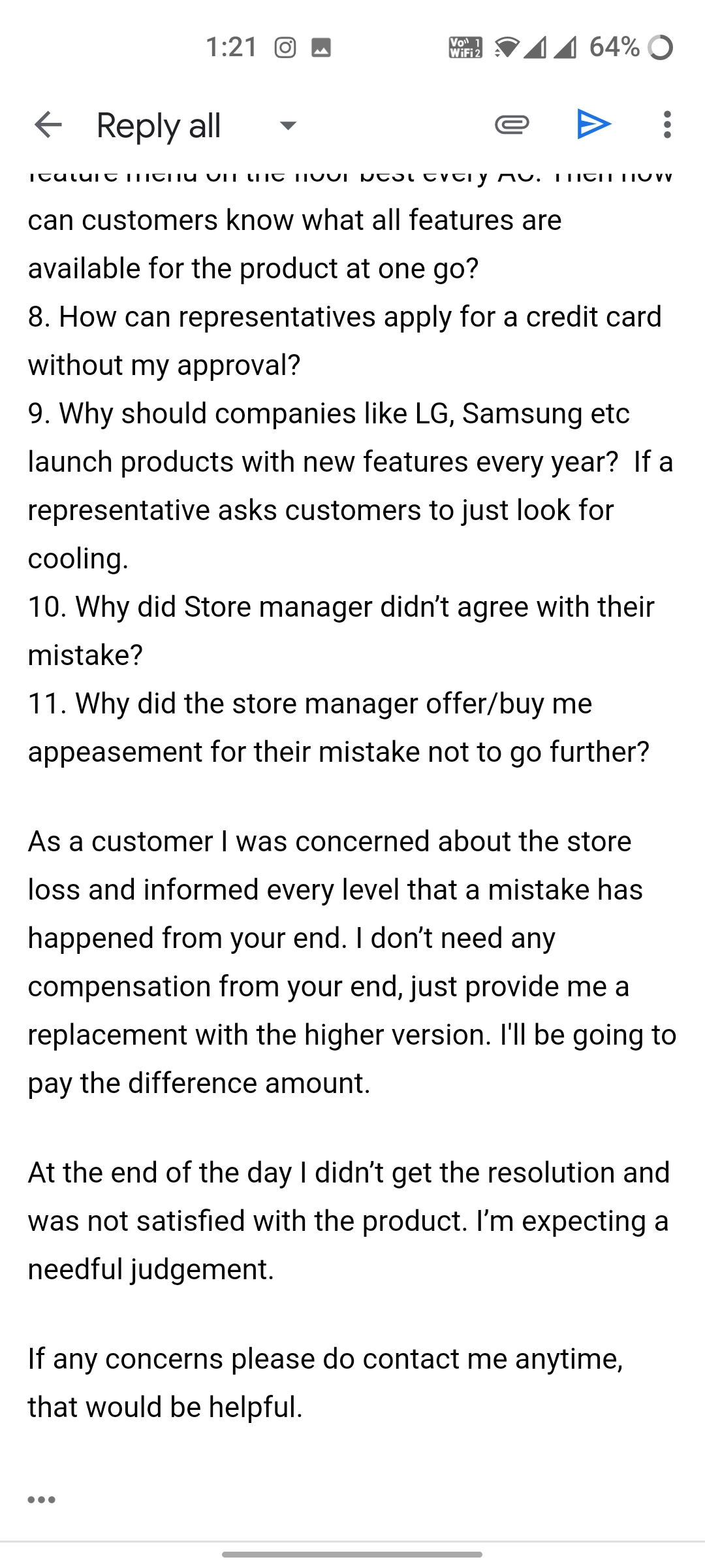 I've captured the video recording at every level of escalation as a representative agreeing with his mistake for not explaining the feature and higher version model to me. Around 6:00 PM the store manager was involved in this escalation since I was not moving out of the stores without resolution which was impacting their customers during peak hours. The store manager didn't even know the complete picture and started saying that the sales representative won't miss any feature while explaining to customers and my representative had explained it to you. The store manager didn't know that the representative had already agreed that he didn’t mention those features to me during the purchase, and suddenly after the manager's support, everyone was not agreeing with their mistakes and blaming me stating that go and complain anywhere you want, right now we won’t be able to provide any kind of replacement or refund.
