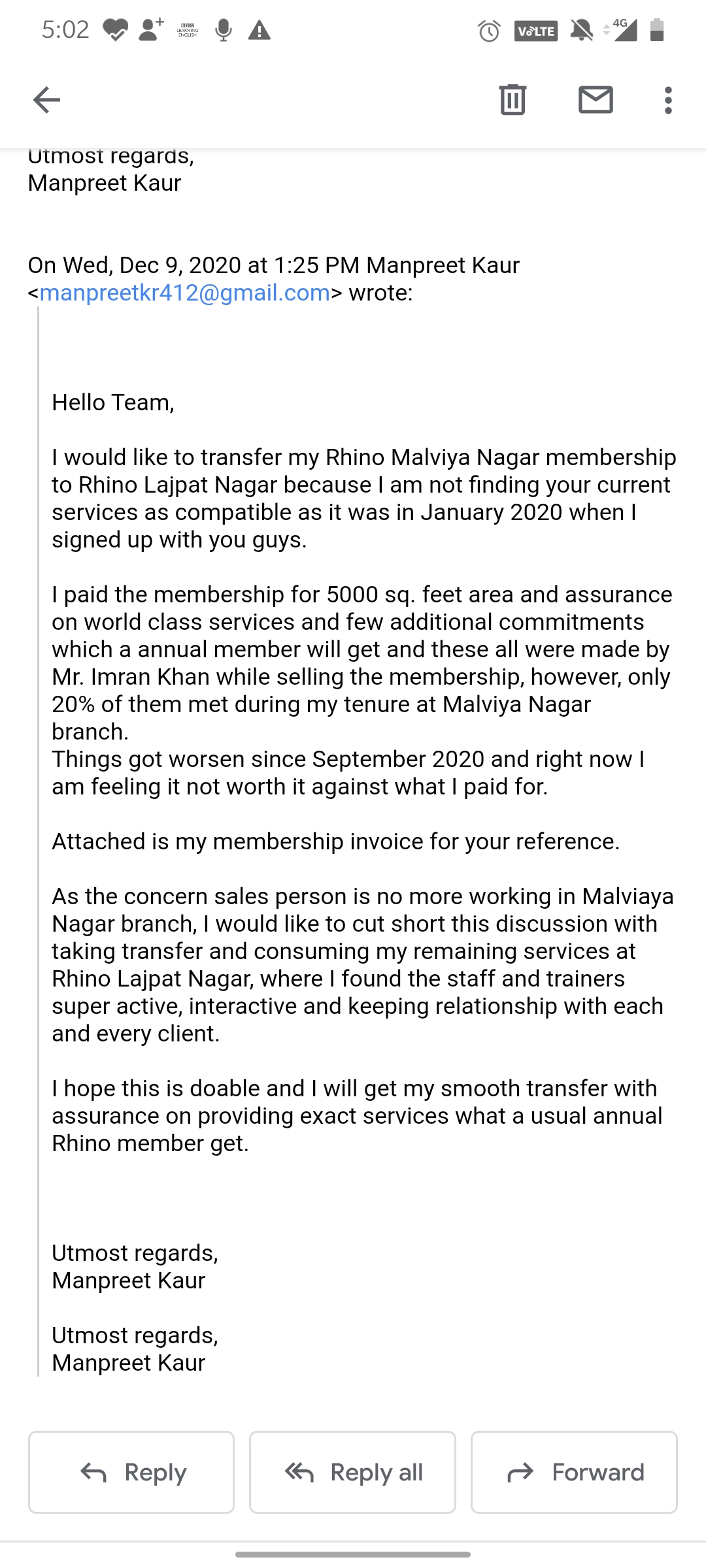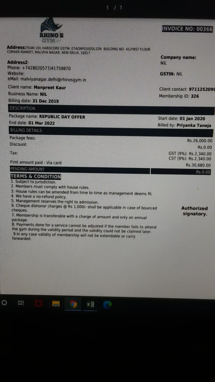 I attended the gym from January till March and then the covid-19 lockdown happened, after a lockdown in September 2020 when I joined because my gym was not following any guidelines for pandemic I got Covid Positive in November 2020. In December when I asked to transfer my remaining months' membership to Rhino Lajpat Nagar gym which was following all the covid protocols, Rhino Malviya Nagar owners denied my membership package transfer because they don't want to do the partial payment of my fees to Lajpat Nagar.