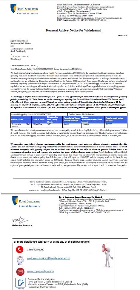 That the Health Forever Policy No. HC00018224000113 of this customer is effective till 21/08/2020 and he is a loyal customer of said product for last fourteen(14) years, since 23/08/2006 and there is no claim in the policy as on date. Whereas, your "Renewal Advice-Notice for Withdrawal" dated 18/05/2020 sent through email to this customer on dated 18 May 2020 confirms that said product is no longer financially viable, according to your company, and therefore you are withdrawing said product with effect from 1st October 2019 completely from market.