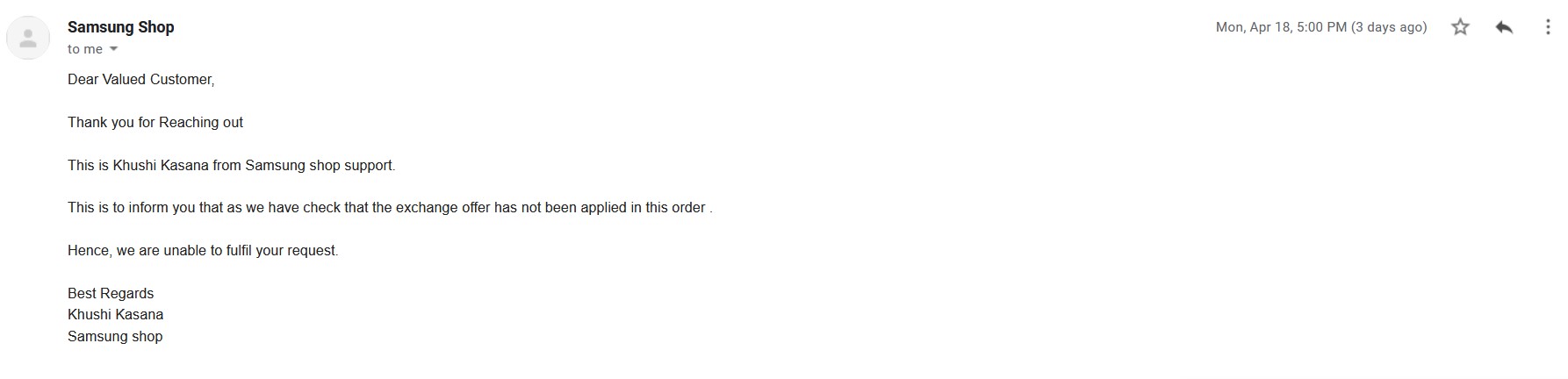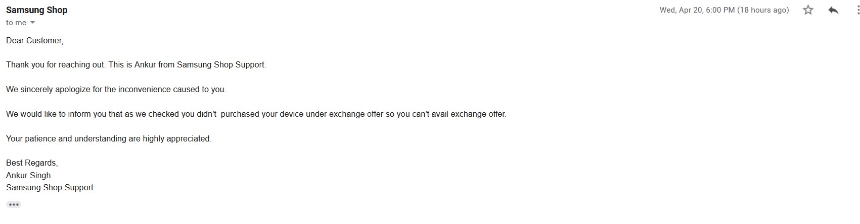 Another day later, I received an email from Samsung Online store. They informed me that there is no exchange offer in this purchase. This has happened many times now. I keep getting similar replies.